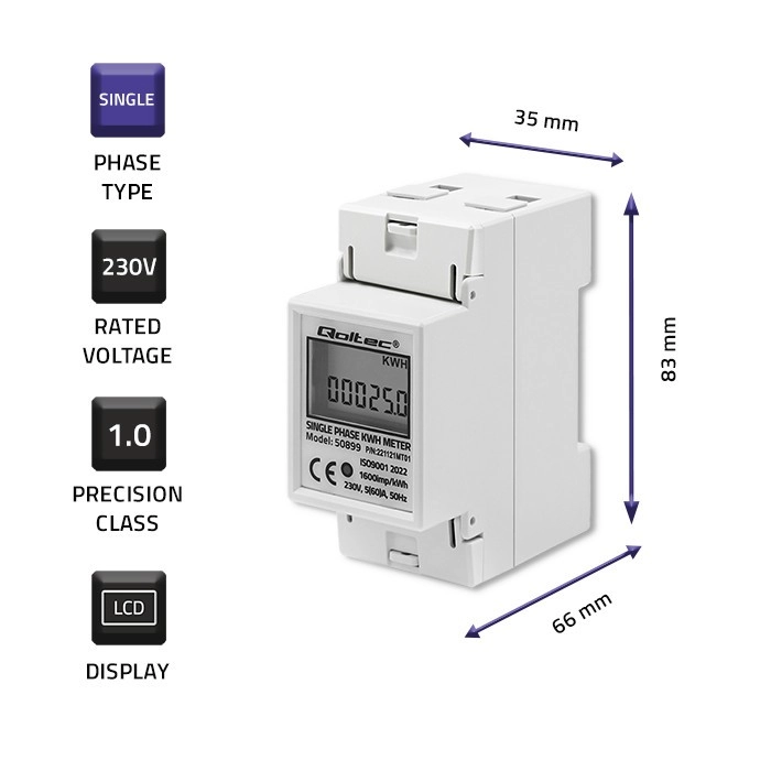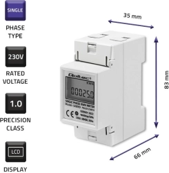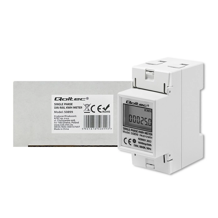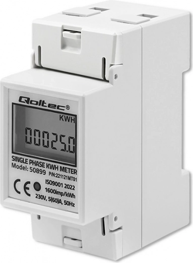 El medidor de energía electrónico de Qoltec ofrece monitorización constante del consumo eléctrico para dispositivos monofásicos alimentados con corriente alterna de 230V a 50Hz. Está equipado con un indicador LED, que señala el consumo de energía, y una pantalla LCD que muestra el valor de la energía consumida en función del número de impulsos con una constante de 1600 imp/kWh. El medidor está diseñado para montaje en carril DIN TH35, lo que permite una instalación y uso sencillos.