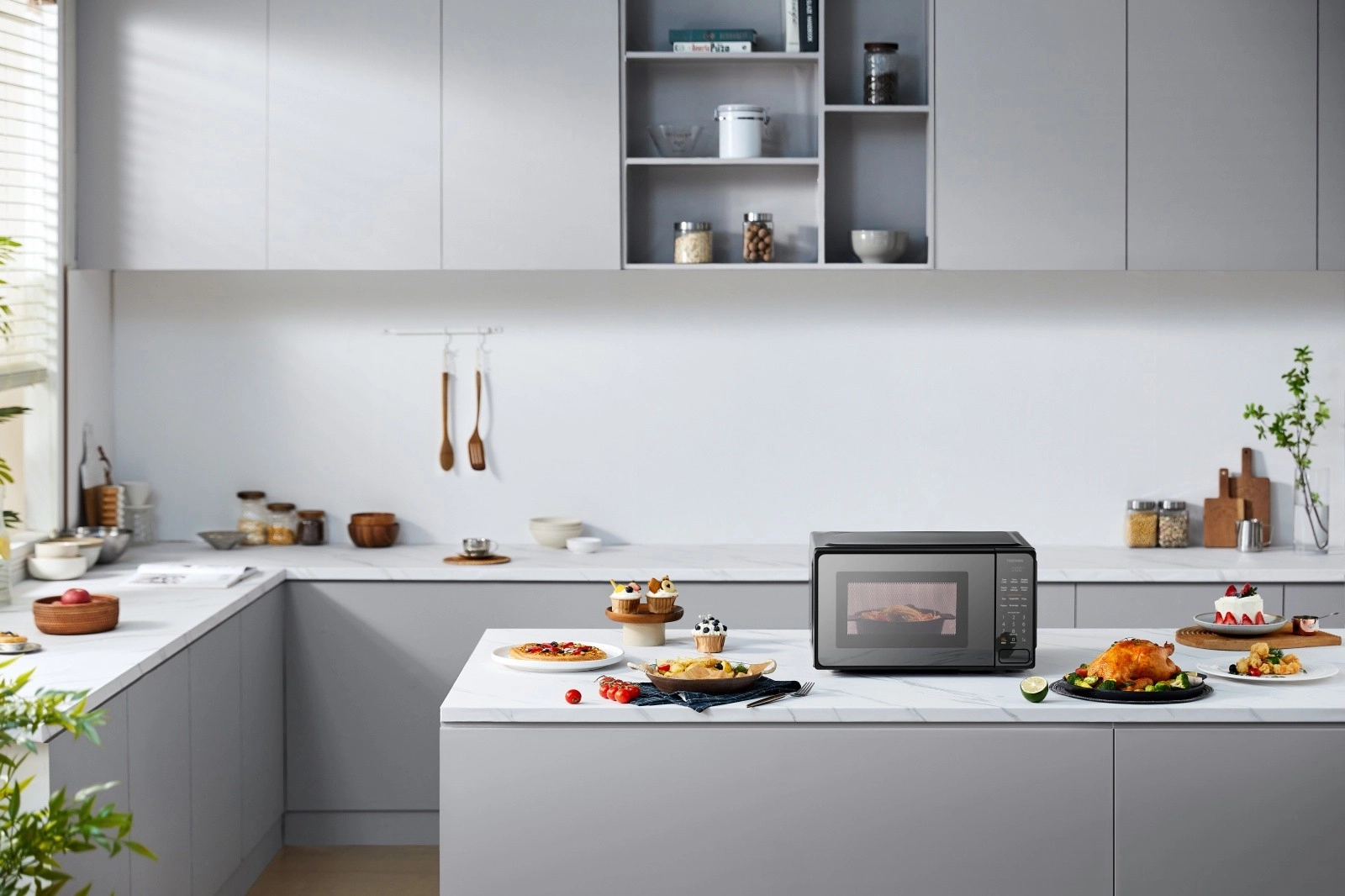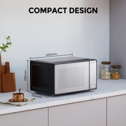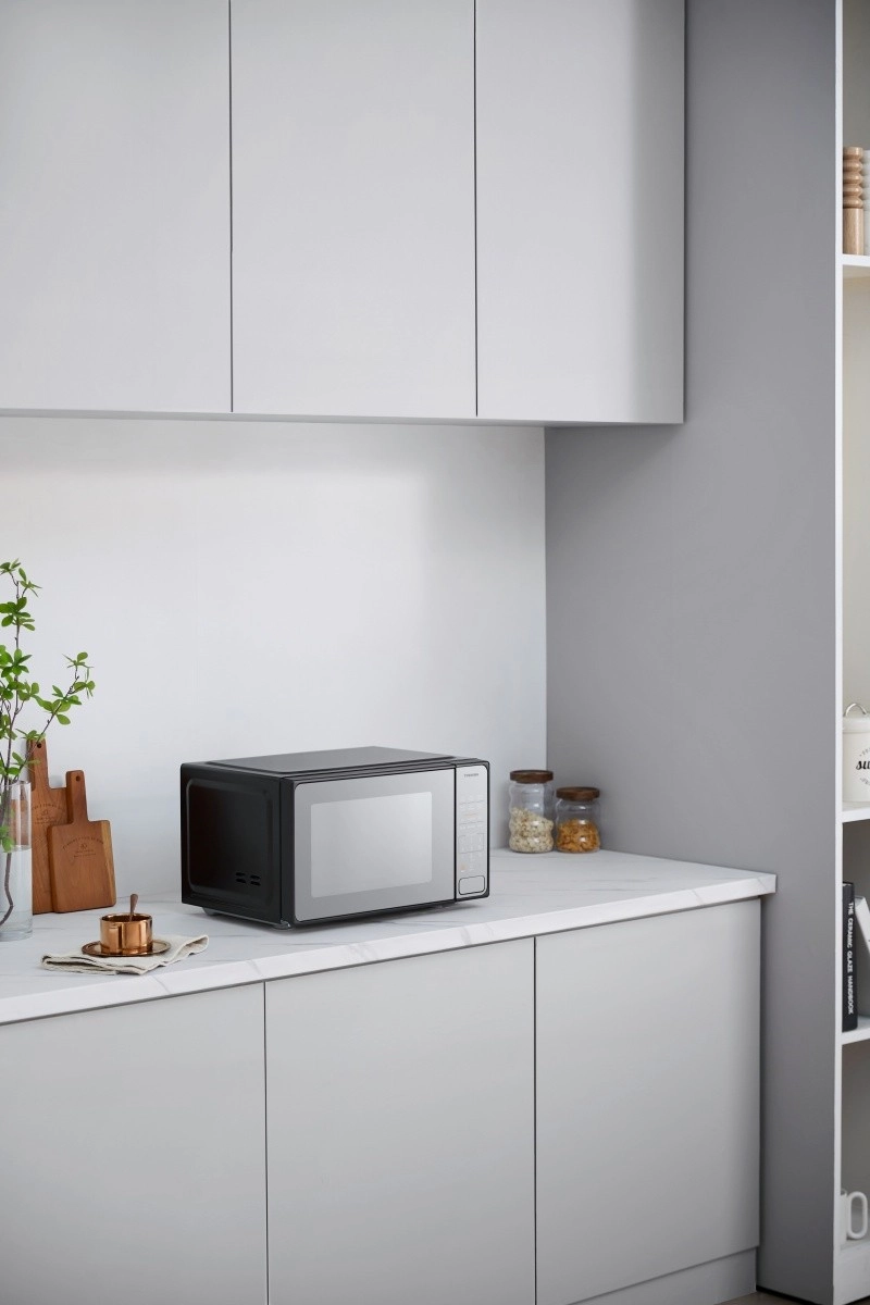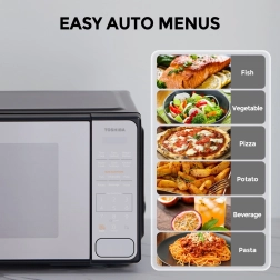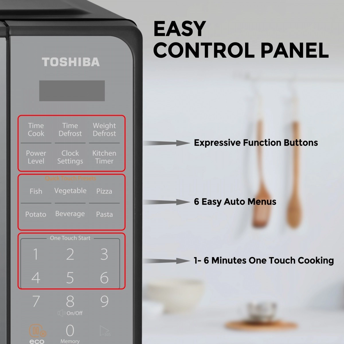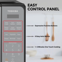 Descubre la facilidad de la cocina diaria con el microondas Toshiba, que gracias a sus dimensiones compactas encaja en la mayoría de las cocinas. El moderno acabado espejo complementa con estilo el interior y el claro panel táctil garantiza un acceso rápido a las funciones más populares.