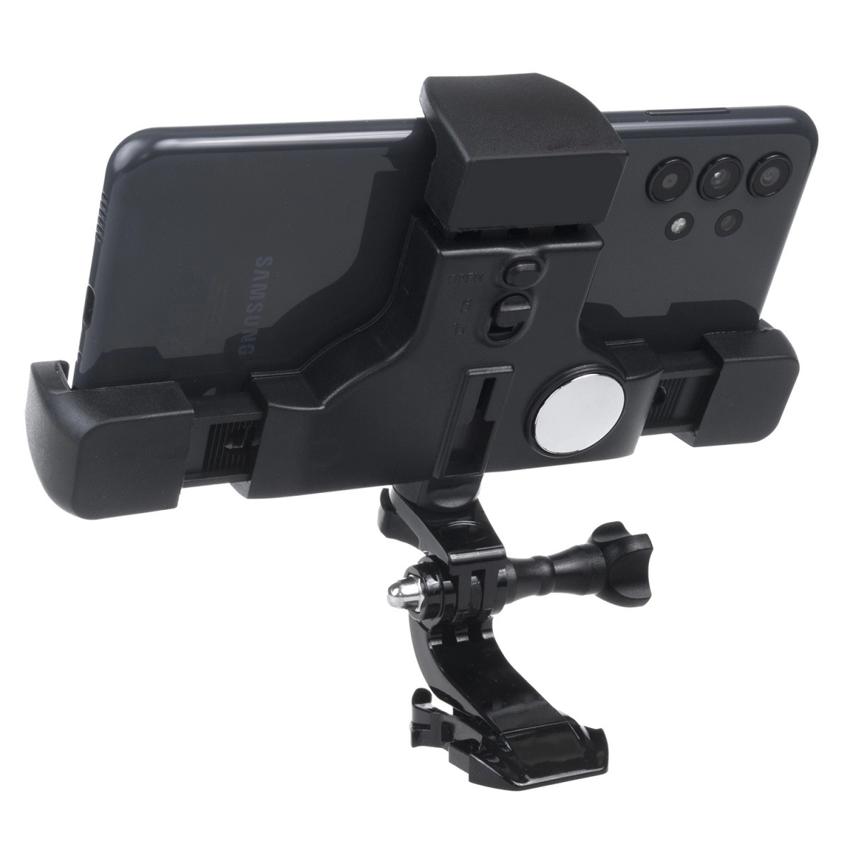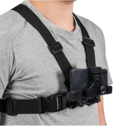 El arnés está fabricado con plástico de alta calidad y goma elástica para una gran durabilidad y confort. Permite montar un smartphone, una cámara fotográfica y una GoPro en el centro del pecho para tomas estables desde la perspectiva en primera persona. El espejo de control integrado ayuda a ajustar rápidamente el encuadre correcto.