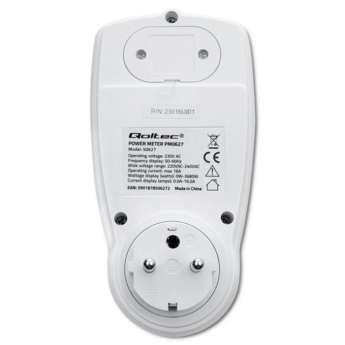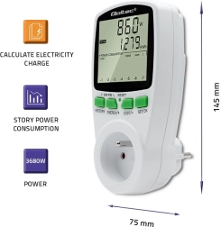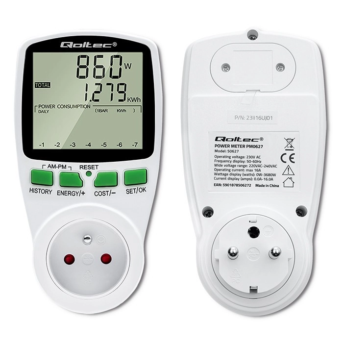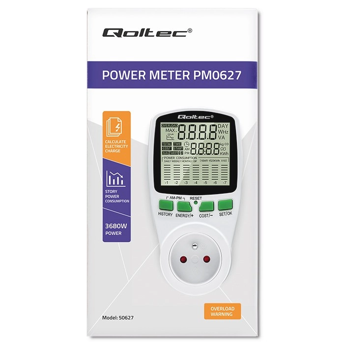 Identifique qué dispositivos son los mayores “devoradores” de energía. El Qoltec PM0627 proporciona mediciones precisas sin estimaciones, para que pueda calcular los costes con fiabilidad y evaluar la eficacia del ahorro. Gracias a la pantalla LCD retroiluminada comprobará fácilmente la potencia actual, el total de kWh, la hora y el coste según la tarifa introducida.