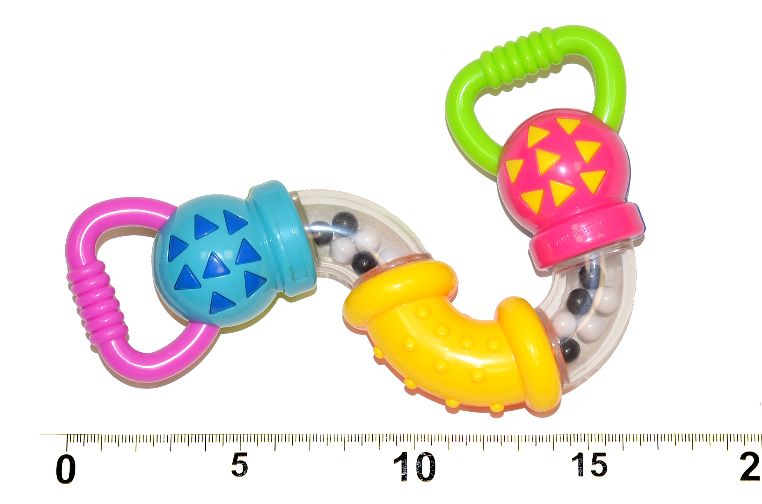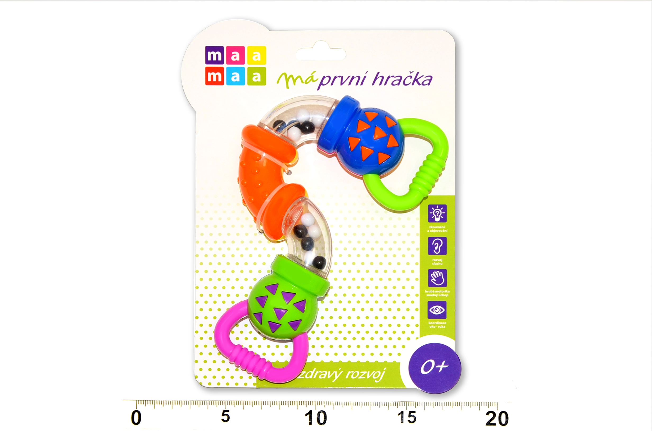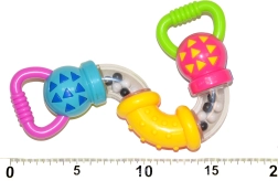 Colorido sonajero para los más pequeños que apoya el desarrollo de los sentidos y la motricidad fina. Gracias a los tubitos giratorios y a las bolitas sonoras emite sonidos agradables, tiene asas cómodas para un agarre fácil y un tamaño ideal para la manita del bebé.