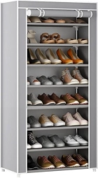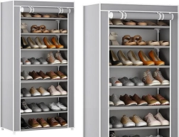 Práctico y estable estante para zapatos de 8 niveles con funda antipolvo que alberga hasta 40 pares de calzado y mantiene el recibidor o vestidor en perfecto orden. Gracias a las puertas enrollables con cremallera, el acceso es rápido y cómodo; además, el acabado en gris combina con cualquier interior.