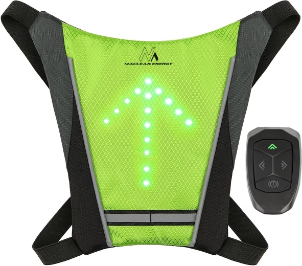 Aumenta tu visibilidad y seguridad con el chaleco LED reflectante MACLEAN ENERGY con señalización direccional integrada. El mando inalámbrico en el manillar conmuta la dirección de marcha (adelante, izquierda, derecha) y la luz de STOP; el chaleco también puede fijarse a la mochila. La batería de litio recargable con carga USB es ideal para ciclismo, senderismo y actividades al aire libre de día y de noche.