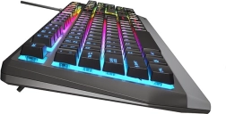 La impresionante iluminación RGB con 11 modos permite ajustar tanto la velocidad como la intensidad de los efectos. En el modo de usuario puedes elegir uno de los 8 tonos RGB predefinidos para 7 zonas independientes y así armonizar el teclado con tu setup gaming. La estabilidad está garantizada por almohadillas de goma antideslizantes y patas abatibles para un ángulo de escritura ideal.