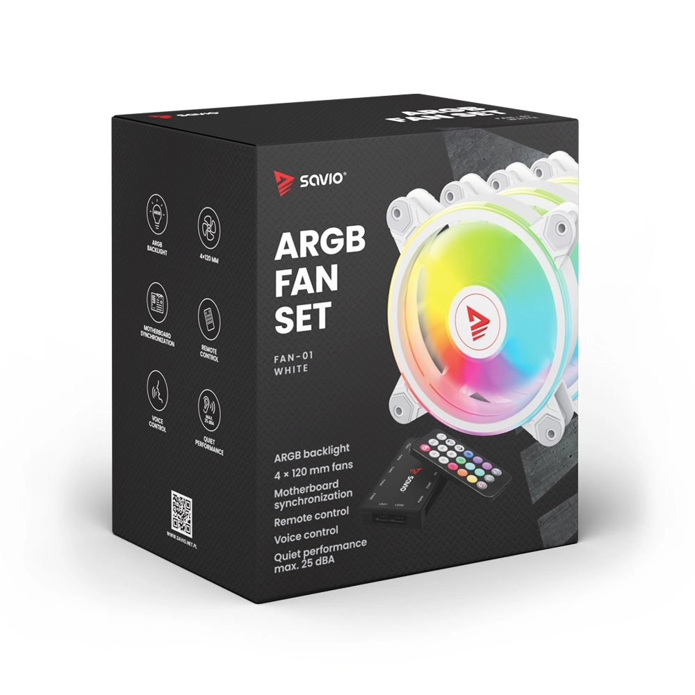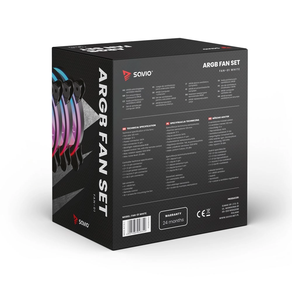 El juego de cuatro ventiladores de la marca Savio ofrece una refrigeración potente e impresionante iluminación ARGB para tu ordenador. El paquete incluye un controlador y un mando a distancia que permiten personalizar fácilmente los efectos de luz y la velocidad de los ventiladores.