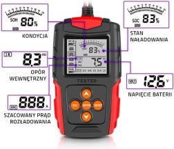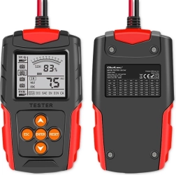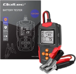 El práctico probador digital de baterías QOLTEC ofrece una diagnosis rápida del acumulador con una pantalla LCD clara. Permite medición precisa del voltaje, corriente de arranque CCA, resistencia interna y la condición y vida útil generales de la batería. Es compatible con baterías de 12V y 24V, no requiere alimentación externa y gracias a sus dimensiones compactas cabe en cualquier coche. Incluye protección contra inversión de polaridad para un uso seguro.