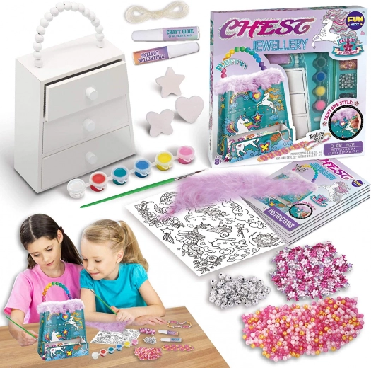 - El contenido del set incluye una caja de joyas de madera, pincel, 6 pinturas, cuerda, pegamento y una amplia gama de decoraciones.