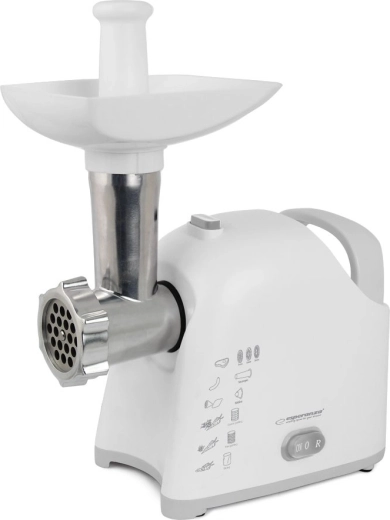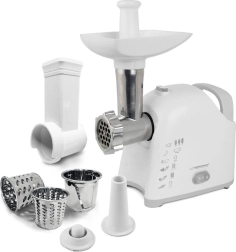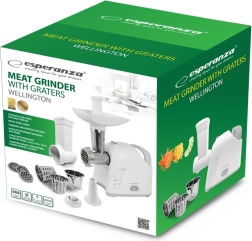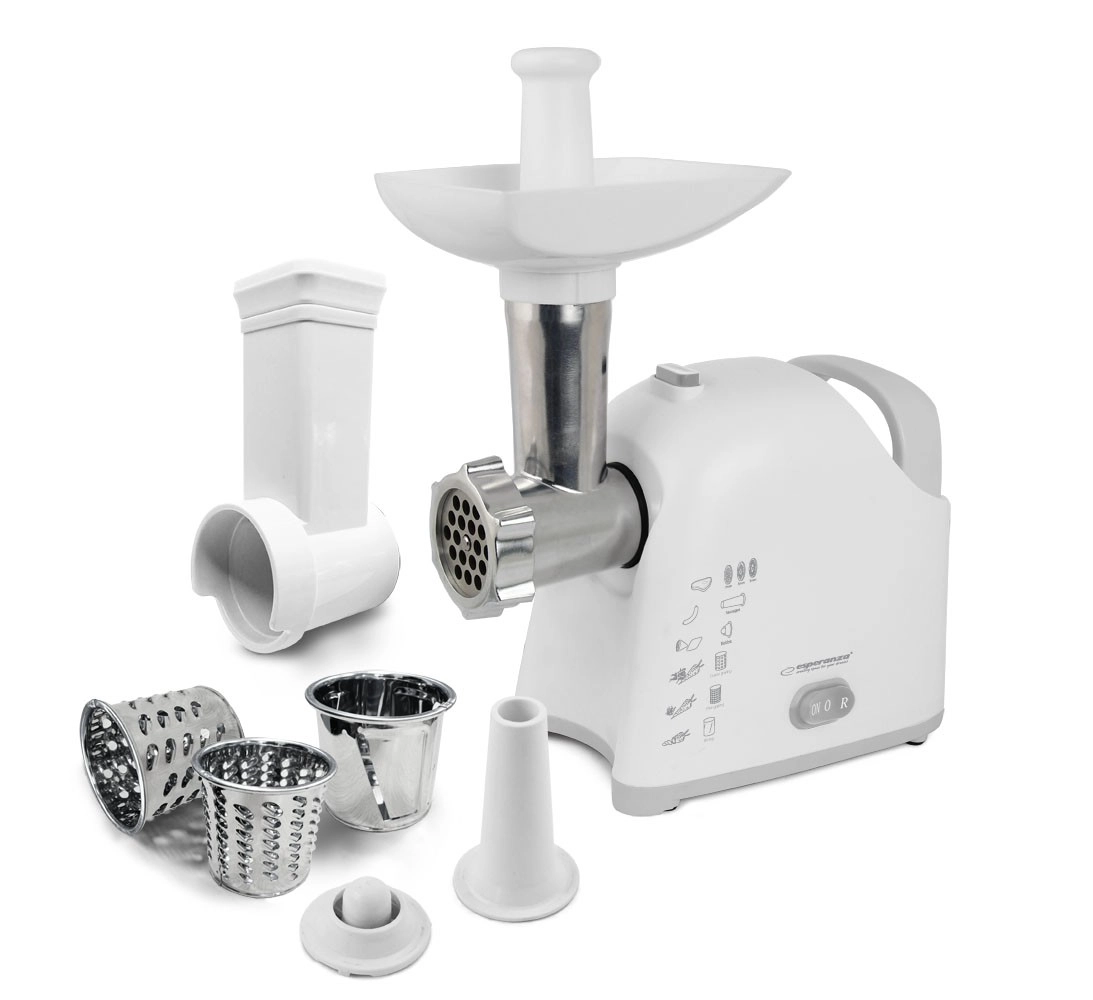 La picadora de carne universal con rallador ESPERANZA Wellington combina alto rendimiento y practicidad para cualquier cocina. Gracias a su motor de hasta 2200 W, muele fácilmente carne y otros ingredientes, y con tres discos de molienda obtendrás la textura deseada. Los accesorios intercambiables permiten la elaboración de salchichas y de kebab/kebbe, mientras que los tres tambores ralladores procesan rápidamente fruta, verdura, queso, chocolate o frutos secos. El accionamiento sinfín metálico, el cuchillo de acero inoxidable y las patas antideslizantes garantizan una larga vida útil y un funcionamiento seguro.