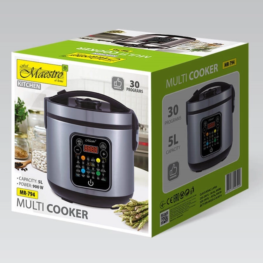 Descubra la versatilidad de la cocina con el multicooker MAESTRO MR-794. Gracias a su capacidad de 5 l, potencia de 900 W y 30 programas automáticos, preparará sopas, arroz, guisos, postres y platos horneados. El panel táctil, la regulación electrónica de la temperatura y el temporizador garantizan resultados precisos sin esfuerzo.