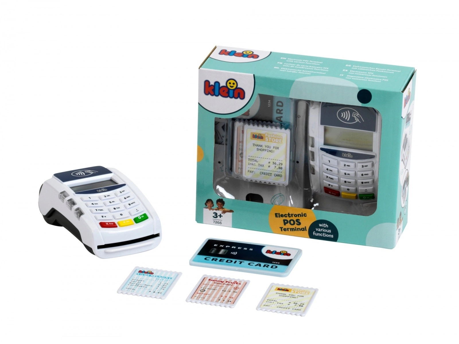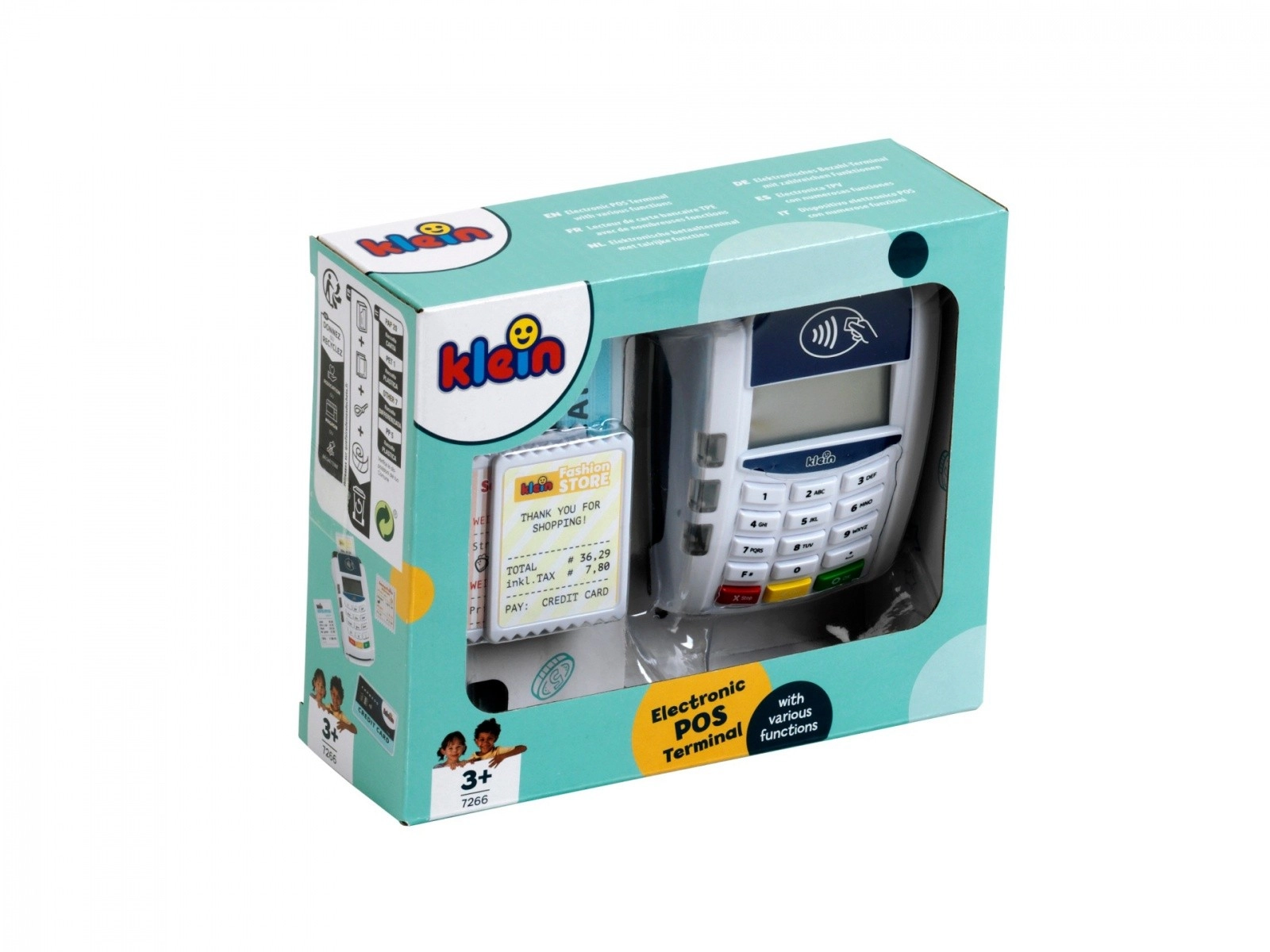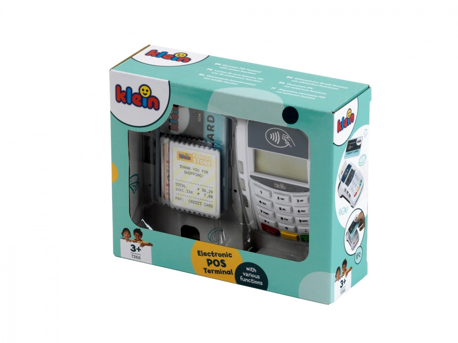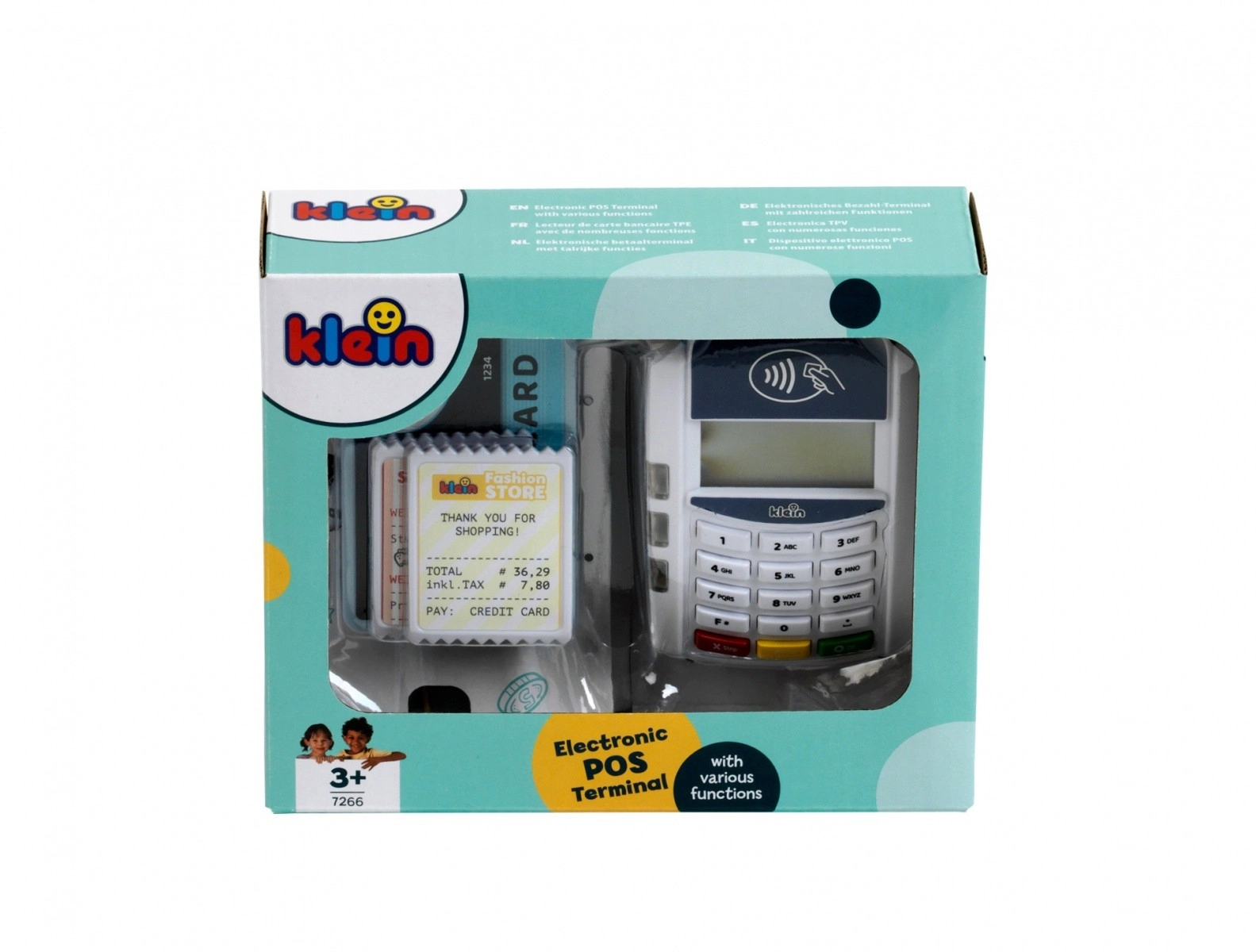 Descubre el divertido mundo de los pagos con el terminal infantil KLEIN, que imita fielmente un dispositivo real. Gracias a la tecnología sin contacto, los sonidos y los efectos luminosos, los niños podrán probar el papel de vendedor y cliente y aprender cómo se realiza una transacción de pago.
