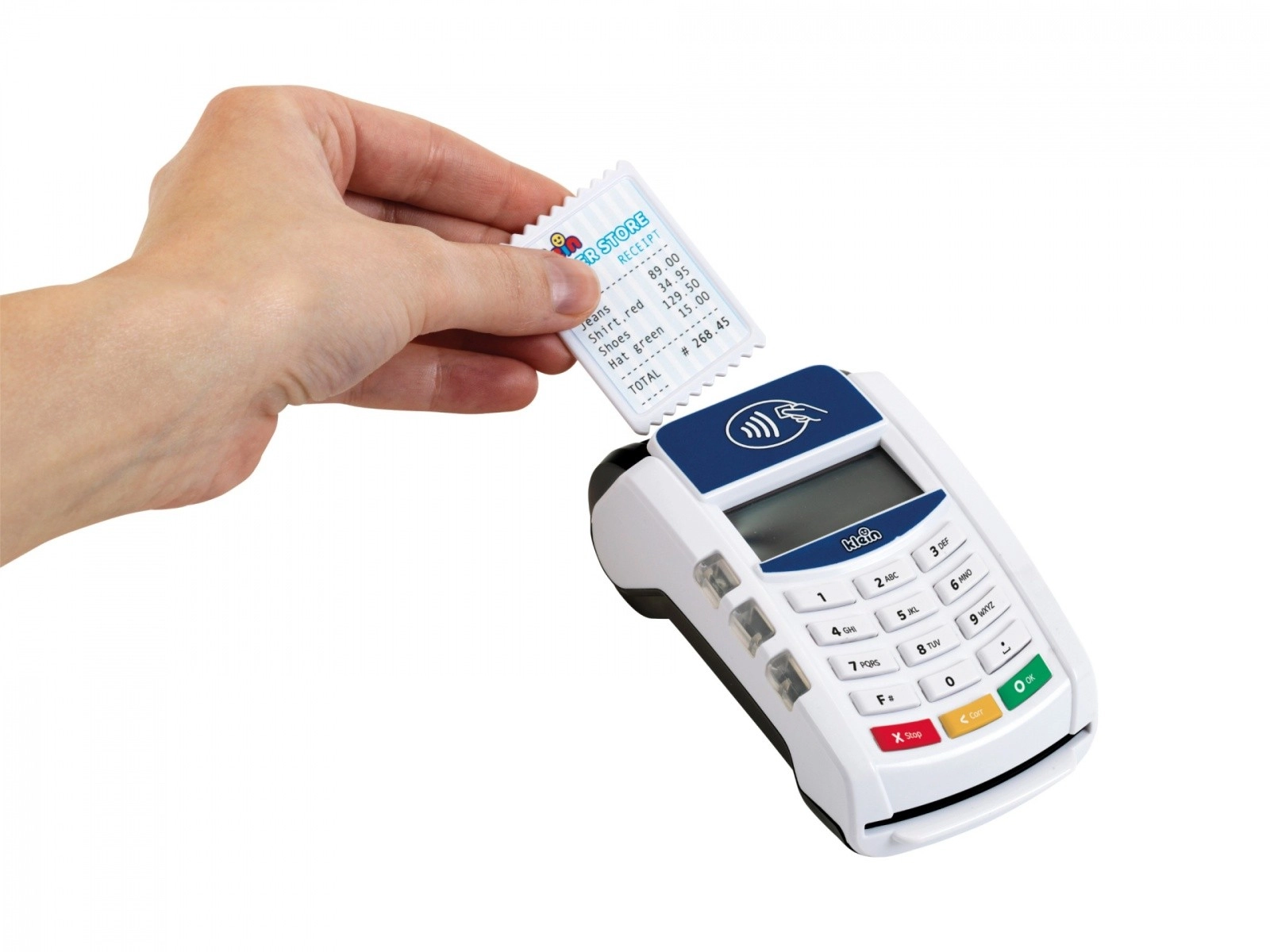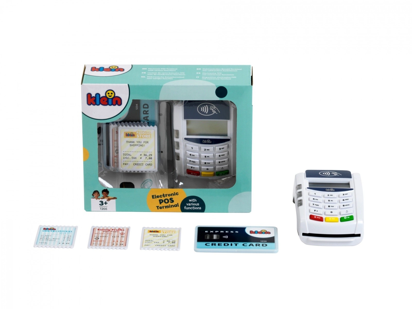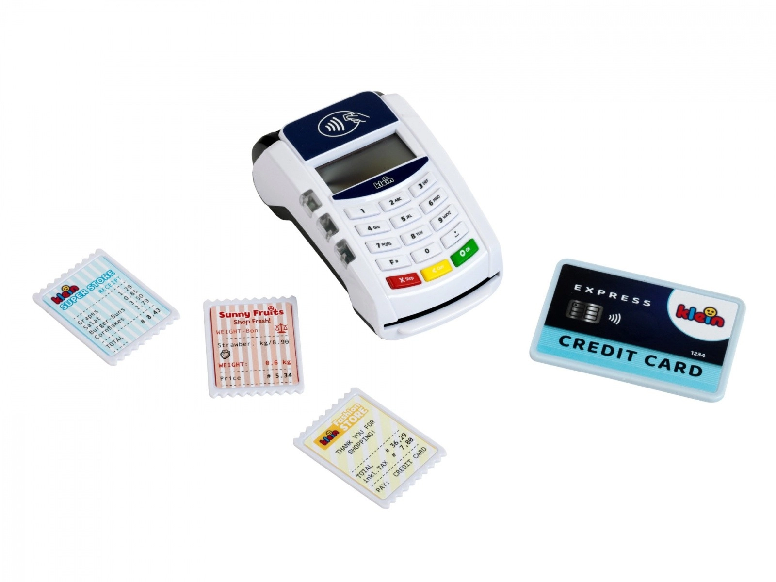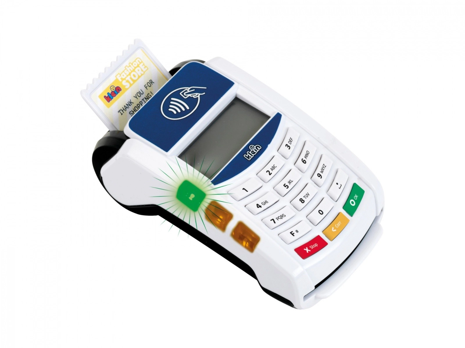 Descubre el divertido mundo de los pagos con el terminal infantil KLEIN, que imita fielmente un dispositivo real. Gracias a la tecnología sin contacto, los sonidos y los efectos luminosos, los niños podrán probar el papel de vendedor y cliente y aprender cómo se realiza una transacción de pago.