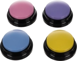 Cuatro botones de colores llamativos en azul, rosa, amarillo y morado, todos con base negra, atraerán la atención no solo de tu mascota.