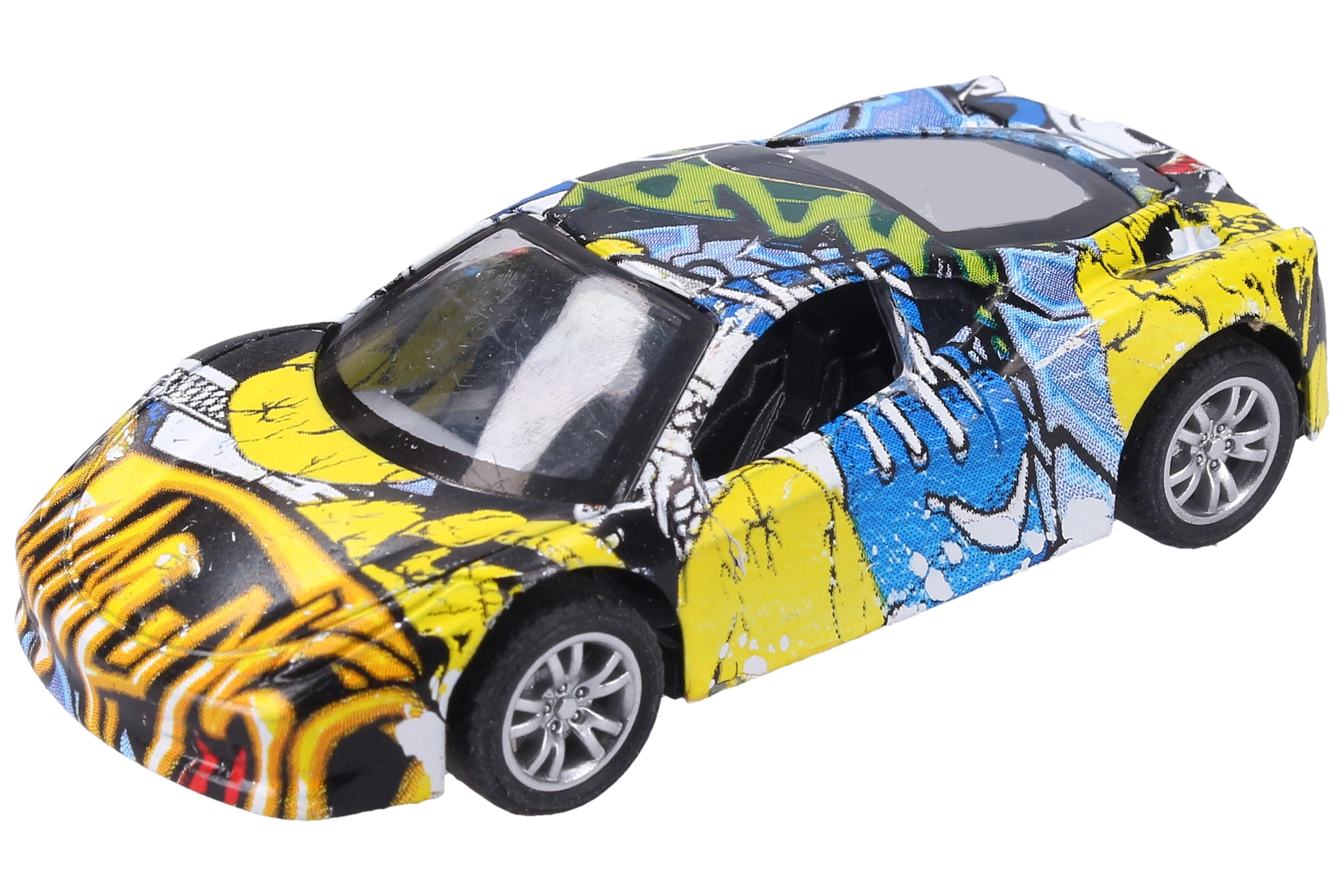 Descubre la diversión con este cochecito metálico con un estampado de graffiti único. Gracias a su fabricación de calidad y al práctico sistema de retroceso, es ideal para carreras en casa y como accesorio con estilo para la colección.