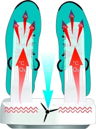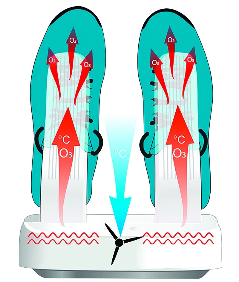 Multi Dryer Ozone Pro combina un secado eficaz con una desinfección avanzada mediante ozono O3. El ozono penetra en las capas internas del calzado, donde elimina hasta el 99,7 % de los mohos y cientos de tipos de bacterias que causan mal olor y problemas cutáneos. El flujo de aire caliente y el ventilador integrado aceleran el secado y cuidan suavemente los materiales.