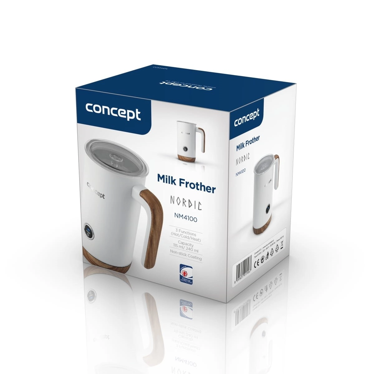 Está equipado con conector británico STRIX y recubrimiento antiadherente, lo que evita que la leche se pegue. La protección contra sobrecalentamiento y la base giratoria garantizan seguridad y facilidad de manejo.
