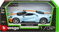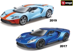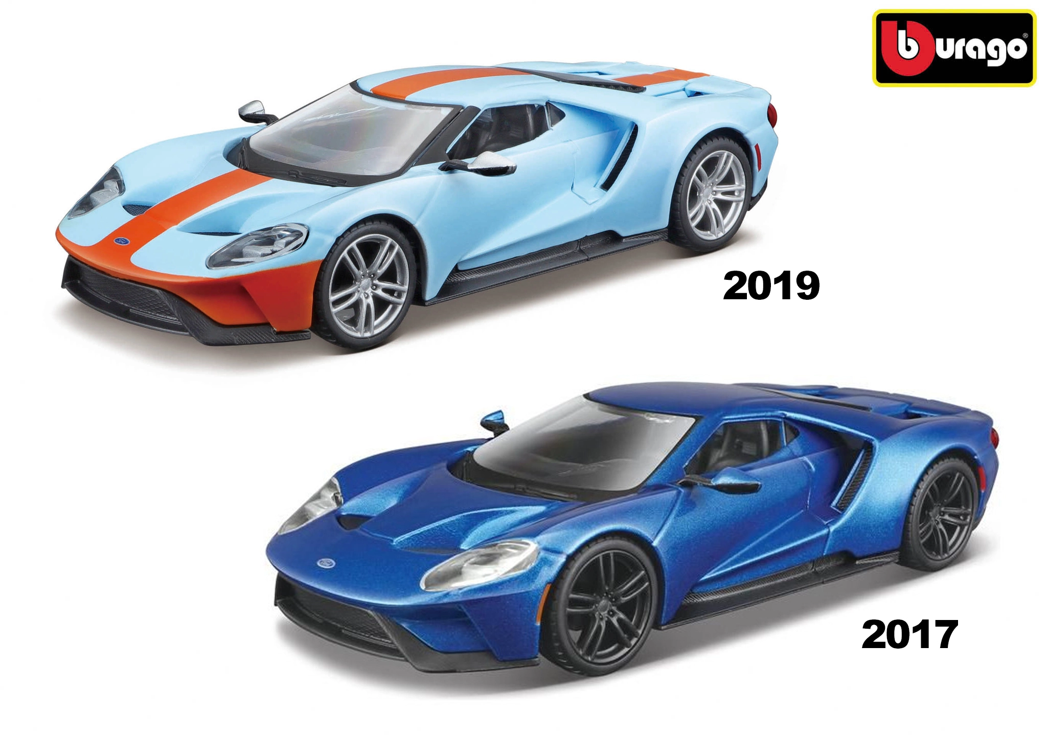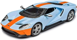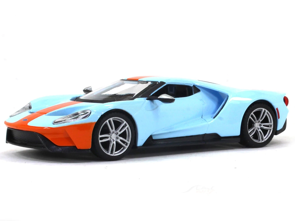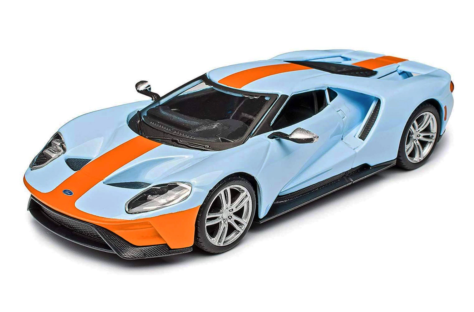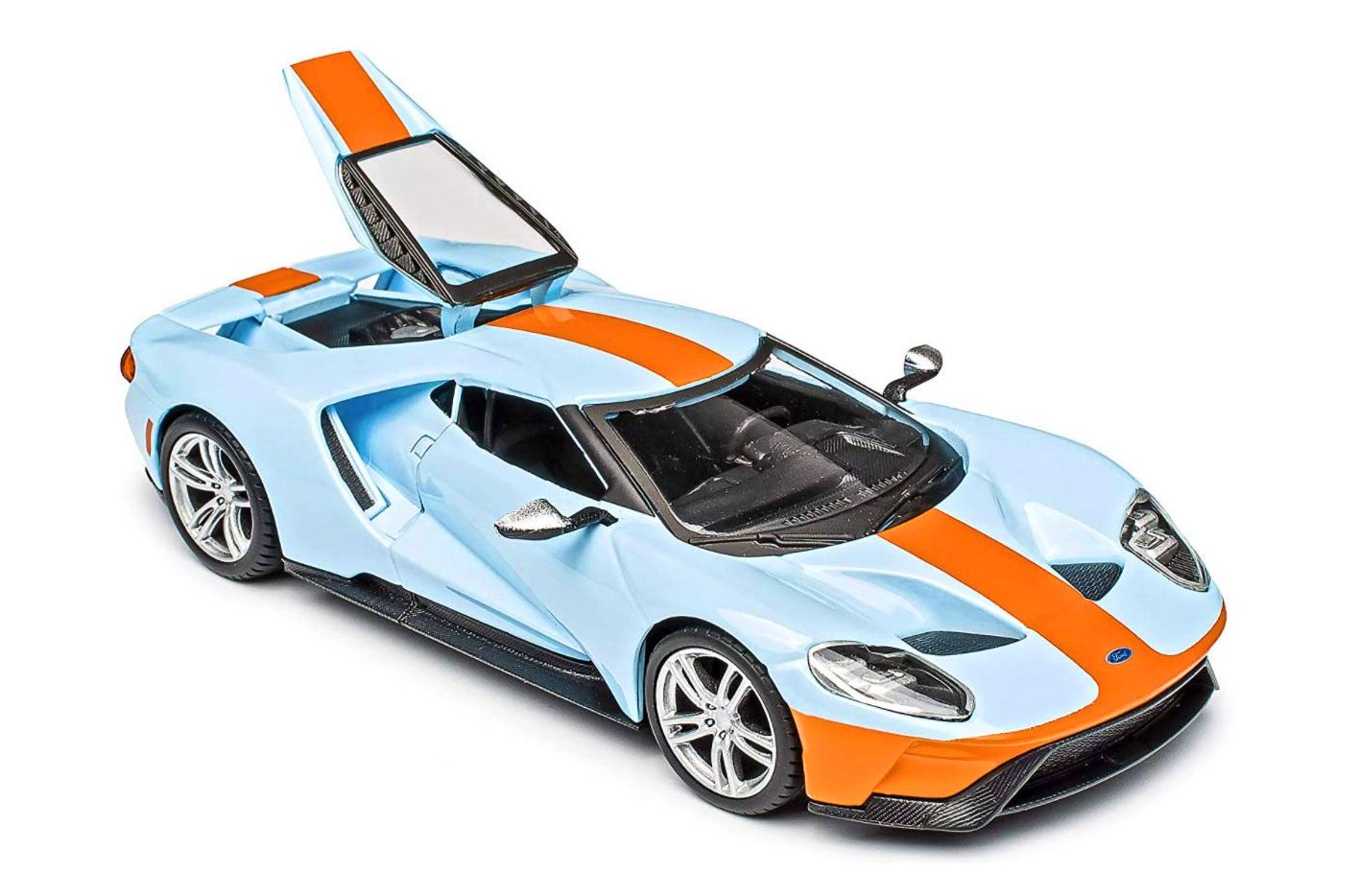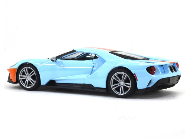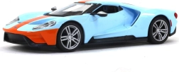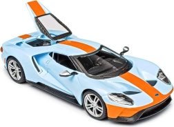 Este modelo con licencia del FORD GT 2017 en atractivo azul metalizado con franjas naranjas de contraste capta fielmente las líneas aerodinámicas del original. Gracias a la combinación de metal fundido (die-cast) y detalles plásticos de calidad, ofrece un aspecto realista y un peso agradable en la mano.