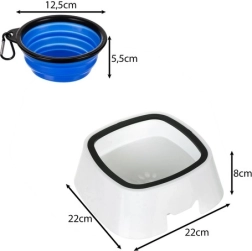 El cuenco es ligero, fácil de transportar y se monta rápidamente para un uso inmediato. Con una capacidad de 1500 ml, es adecuado para perros de todos los tamaños. El paquete incluye también un práctico cuenco plegable de 350 ml, ideal para viajes o actividades al aire libre.