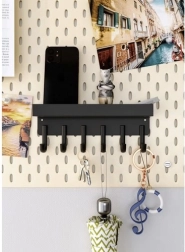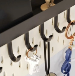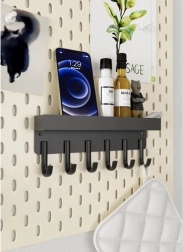 Este organizador de pared universal combina funcionalidad y diseño minimalista. La estructura metálica con recubrimiento en polvo garantiza una larga vida útil, mientras que la repisa superior con borde elevado (aprox. 2,3 cm) mantiene seguro el teléfono, la cartera, el correo y pequeños objetos. Los seis ganchos robustos son ideales para llaves, bufandas, bolsos o utensilios de cocina.