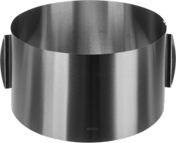 Aro profesional ajustable para tartas de acero inoxidable con altura de 15 cm para bases altas perfectas y postres de varias capas. Gracias a las pinzas robustas es estable incluso con la máxima extensión, se regula fácilmente en el rango de 16–30 cm sin herramientas, es seguro para el contacto con alimentos y se puede lavar en lavavajillas.