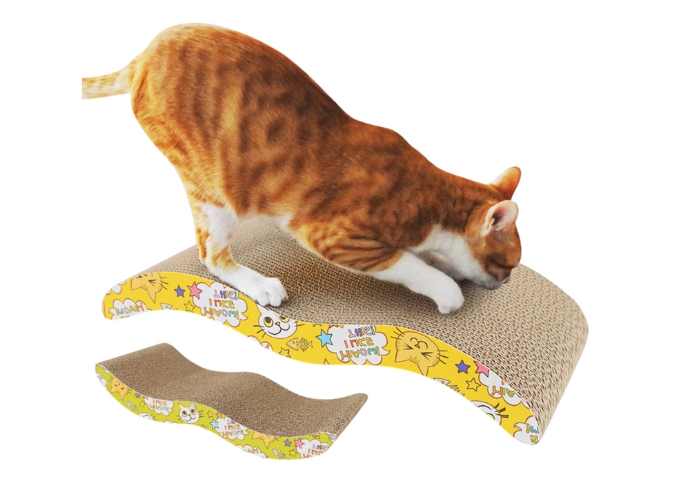 La textura firme del cartón invita al rascado, mientras que el estampado amarillo con motivos de gatos da vida a cualquier interior.