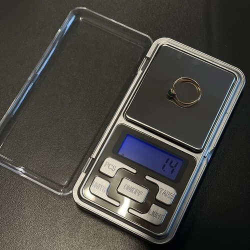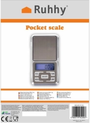 La compacta báscula de bolsillo RUHHY ofrece una precisión de 0,1 g y una capacidad de carga de hasta 500 g, ideal para joyas, monedas, hierbas o medicamentos. Dispone de pantalla LCD retroiluminada, función TARE, varias unidades de medida y apagado automático. Gracias a su tapa protectora y a la alimentación con 2× AAA (incluidas), está lista para usar nada más sacarla de la caja.