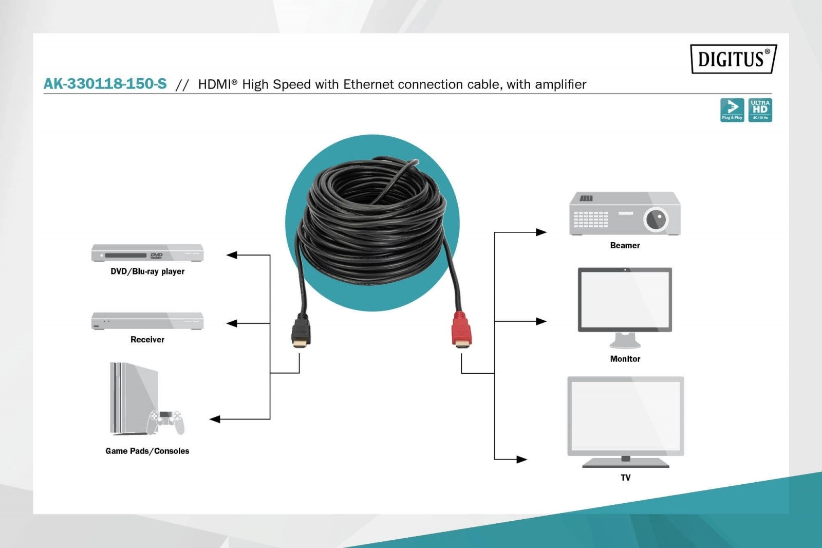 Este cable HDMI activo y direccional es ideal para conectar ordenadores, consolas de videojuegos (p. ej., PS4), reproductores Blu‑ray/DVD y otros dispositivos a televisores, monitores o proyectores. El amplificador integrado mantiene una transmisión estable en una longitud de 15 m, proporcionándote una imagen nítida y un sonido envolvente de calidad sin interferencias.