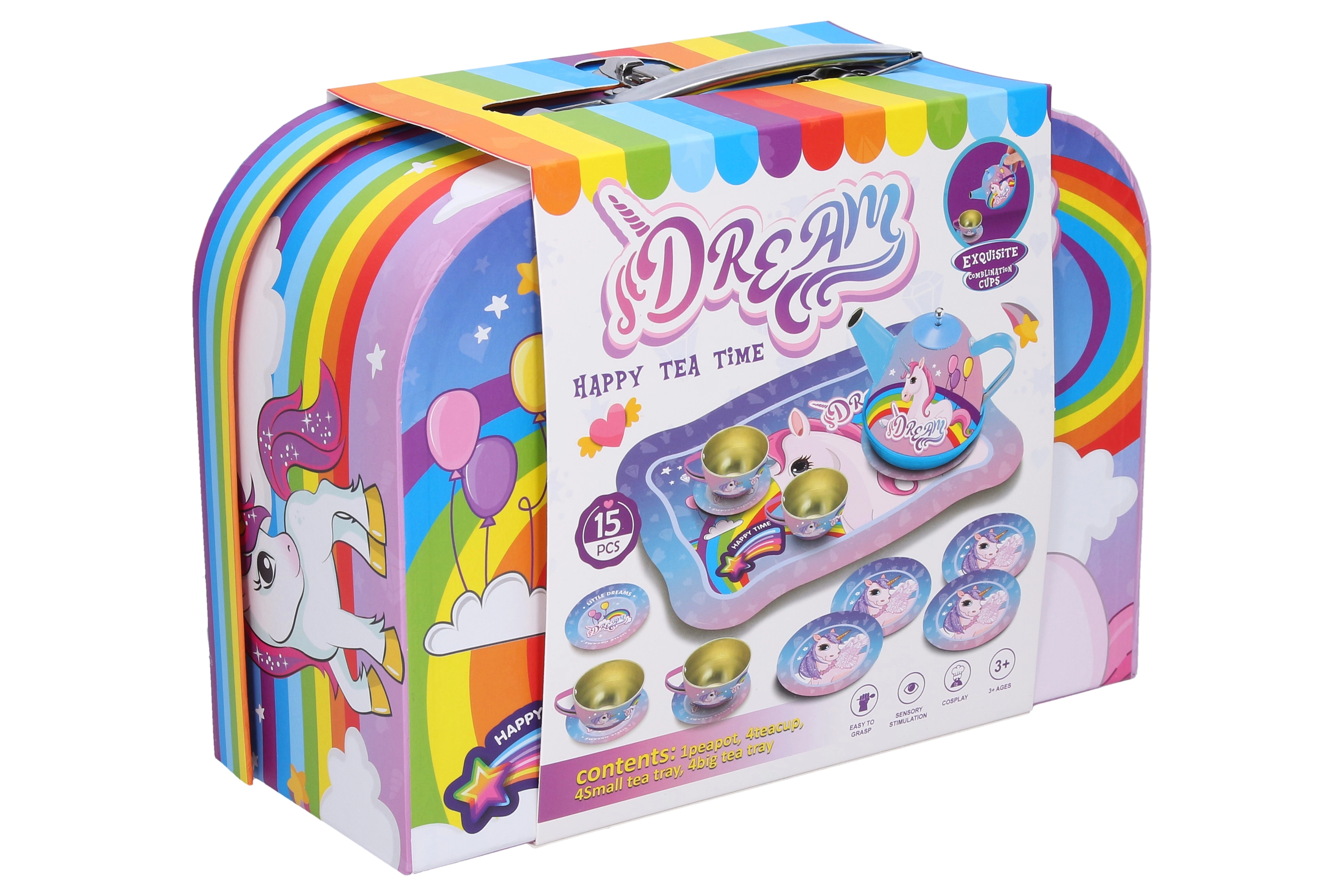 Este estiloso juego de té con diseño de unicornio aporta diversión a cualquier juego infantil de casa. Gracias a su sólida fabricación en metal, resiste incluso el servicio entusiasta de cada día. El colorido maletín con asa permite transportar y guardar fácilmente todas las piezas en un solo lugar.