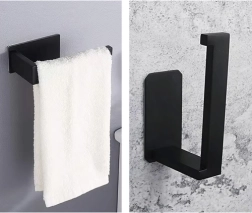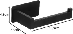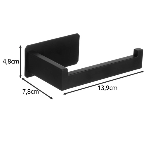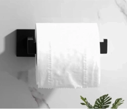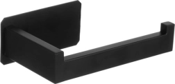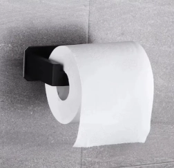Elegante y resistente soporte de papel higiénico en color negro mate de acero inoxidable para baños modernos e industriales. Ofrece montaje fijo con cinta, es resistente a la humedad y puede retirarse sin dañar la superficie. Gracias al inteligente remate en gancho, el papel no se desliza del soporte y la instalación sin herramientas es rápida y limpia.