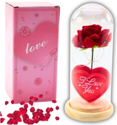 La rosa eterna en cúpula transparente es una decoración con estilo y una declaración simbólica. La luz LED blanco cálido realza la belleza del capullo de aspecto realista e ilumina cualquier interior. La base de madera aporta un aspecto natural y estabilidad, y la cúpula además protege del polvo.