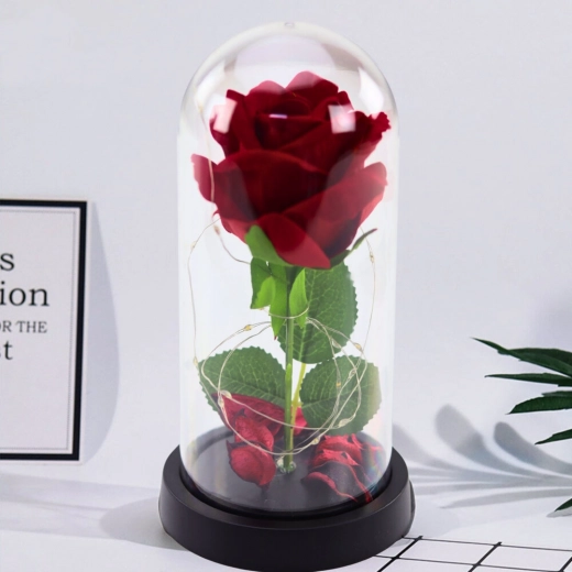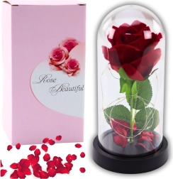 La iluminación LED realza delicadamente la belleza de la rosa y crea un ambiente cálido, ideal para la decoración de interiores y momentos románticos. Los suaves pétalos de rosa que flotan dentro de la cúpula añaden elegancia y romanticismo a toda la composición.