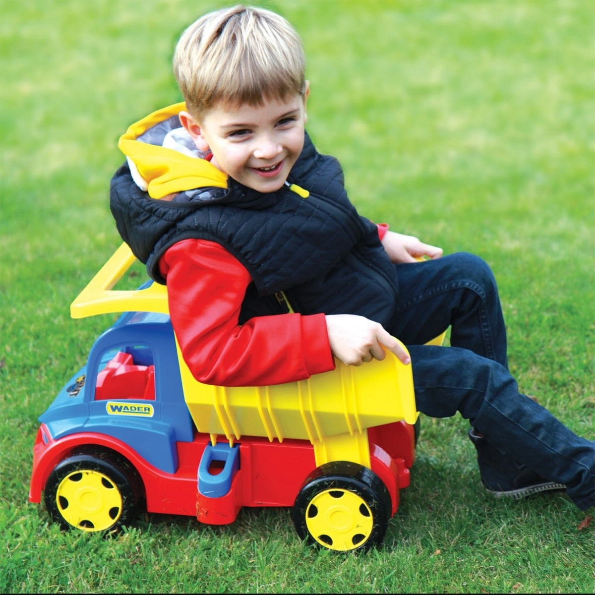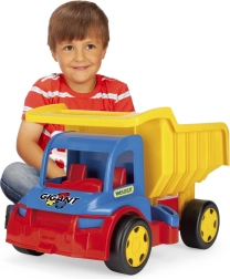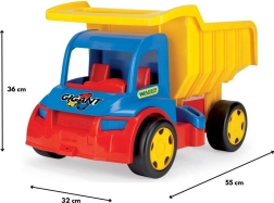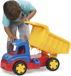 Volquete infantil Gigant 55 cm es un gran camión de carga de 55 cm de largo que a los niños les encantará por la posibilidad de cargar, descargar y transportar sus juguetes favoritos. Está equipado con enganches delanteros y traseros para conectar un remolque o una cuerda de arrastre. La caja volquete con asa cómoda permite un manejo sencillo y un juego interminable. Gracias a su capacidad de carga de hasta 150 kg, el volquete es ideal también como correpasillos: los más pequeños pueden sentarse en el juguete y impulsarse con los pies. La construcción robusta garantiza durabilidad, por lo que es ideal para jugar tanto fuera como dentro de casa.