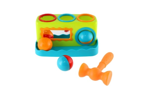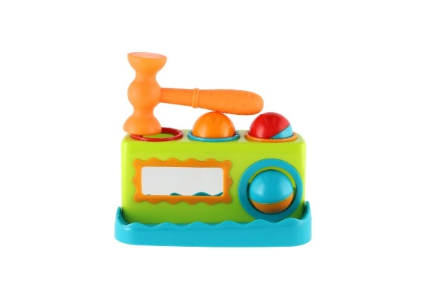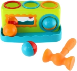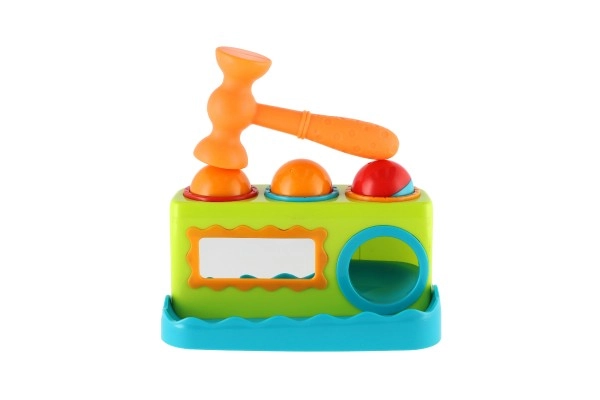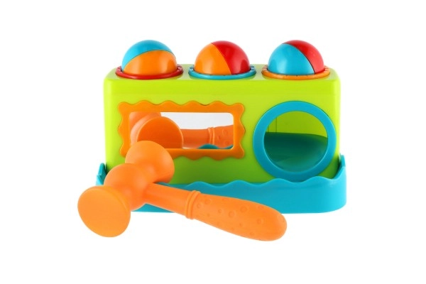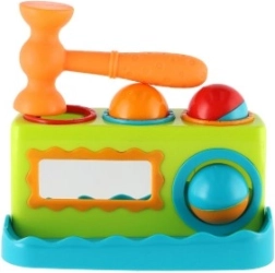 - Banco de golpear, 3 pelotas de colores, martillo de plástico