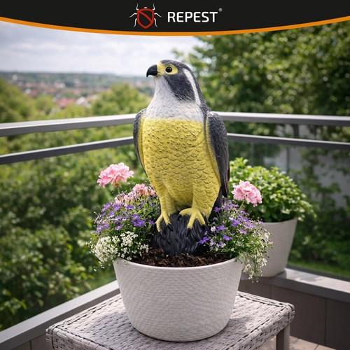 Espantapájaros realista con forma de halcón que protege eficazmente balcones, terrazas y jardines. Gracias a su acabado detallado y coloración natural actúa como un depredador auténtico y ahuyenta de forma fiable palomas, estorninos, gorriones, grajillas y gaviotas. Es resistente a los rayos UV y a la intemperie, se puede lastrar con arena para mayor estabilidad y trasladar fácilmente según sea necesario.
