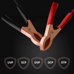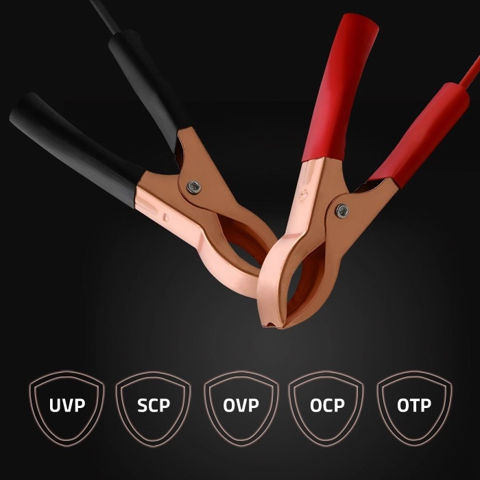 Instalación rápida: conecte la pinza roja al polo +, la negra al polo −, seleccione el modo y la carga puede comenzar. El diseño compacto y resistente facilita su uso en casa y en el taller.