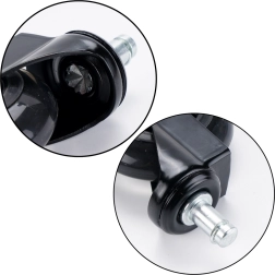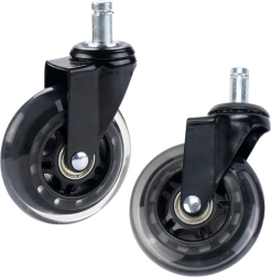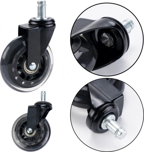 Las ruedas de caucho con superficie blanda y flexible son ideales para suelos de madera, paneles, laminados, baldosas e incluso alfombras, protegiéndolos de daños. La estructura metálica estable de cada rueda garantiza alta resistencia con una capacidad de hasta 50 kg, ofreciendo fiabilidad incluso con uso intensivo en sillas de oficina y gaming.