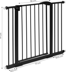 El ancho ajustable de 74–105 cm se adapta fácilmente a la mayoría de aberturas del hogar. Las extensiones y los tornillos tensores incluidos permiten un ajuste preciso. La barrera es adecuada no solo para padres de niños pequeños, sino también para dueños de perros y gatos que necesiten delimitar espacios de forma segura.