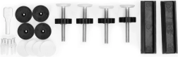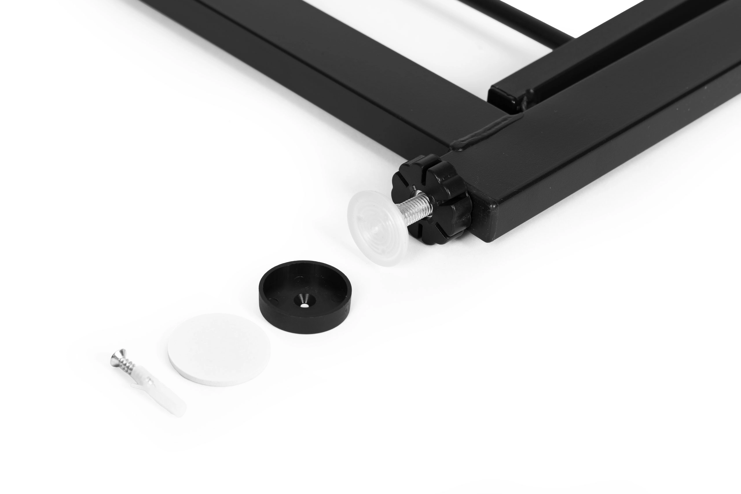 La instalación es sin herramientas y sin taladrar gracias a la fijación a presión de 4 puntos. El paquete incluye almohadillas protectoras que evitan daños en las superficies, así como accesorios para el atornillado fijo en caso de que se requiera una instalación permanente. El acero con recubrimiento en polvo garantiza una larga vida útil y estabilidad.