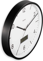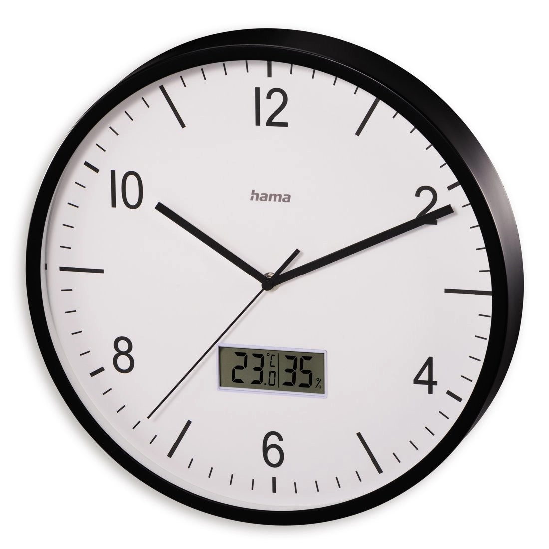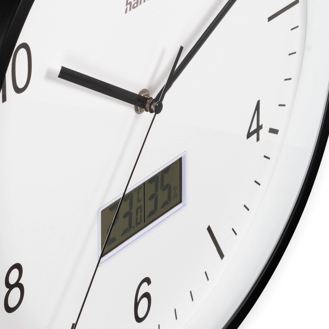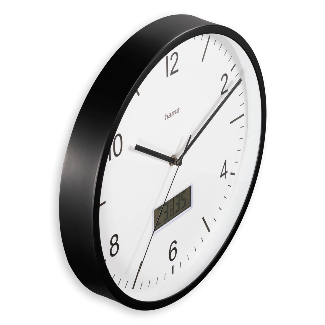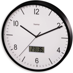Elegante reloj de pared con gran esfera fácil de leer que combina hora analógica y una pantalla digital clara. Gracias al receptor DCF, la hora se sincroniza automáticamente; el funcionamiento silencioso sin tictac no perturba el sueño ni el trabajo, y el higrómetro y el termómetro integrados ayudan a controlar el clima de la habitación. Su diseño atemporal encaja en la cocina, el salón e incluso el baño.
