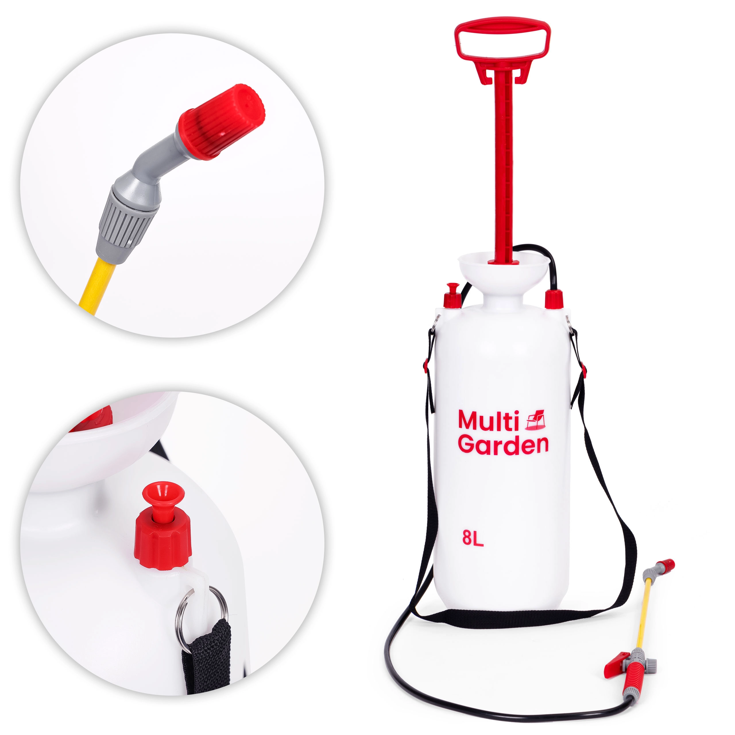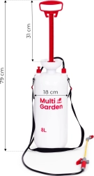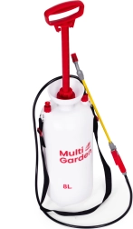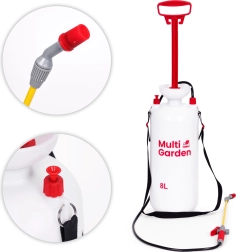 Práctico pulverizador a presión de 8 l de la marca MULTIGARDEN para un cuidado cómodo del jardín y la limpieza alrededor de la casa. Ofrece boquilla ajustable (chorro plano y cono), lanza larga de fibra de vidrio, bomba de pistón, válvula de seguridad y escala de medición en el depósito. Gracias al asa ergonómica y a la correa ajustable, el pulverizador se lleva y maneja cómodamente.