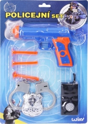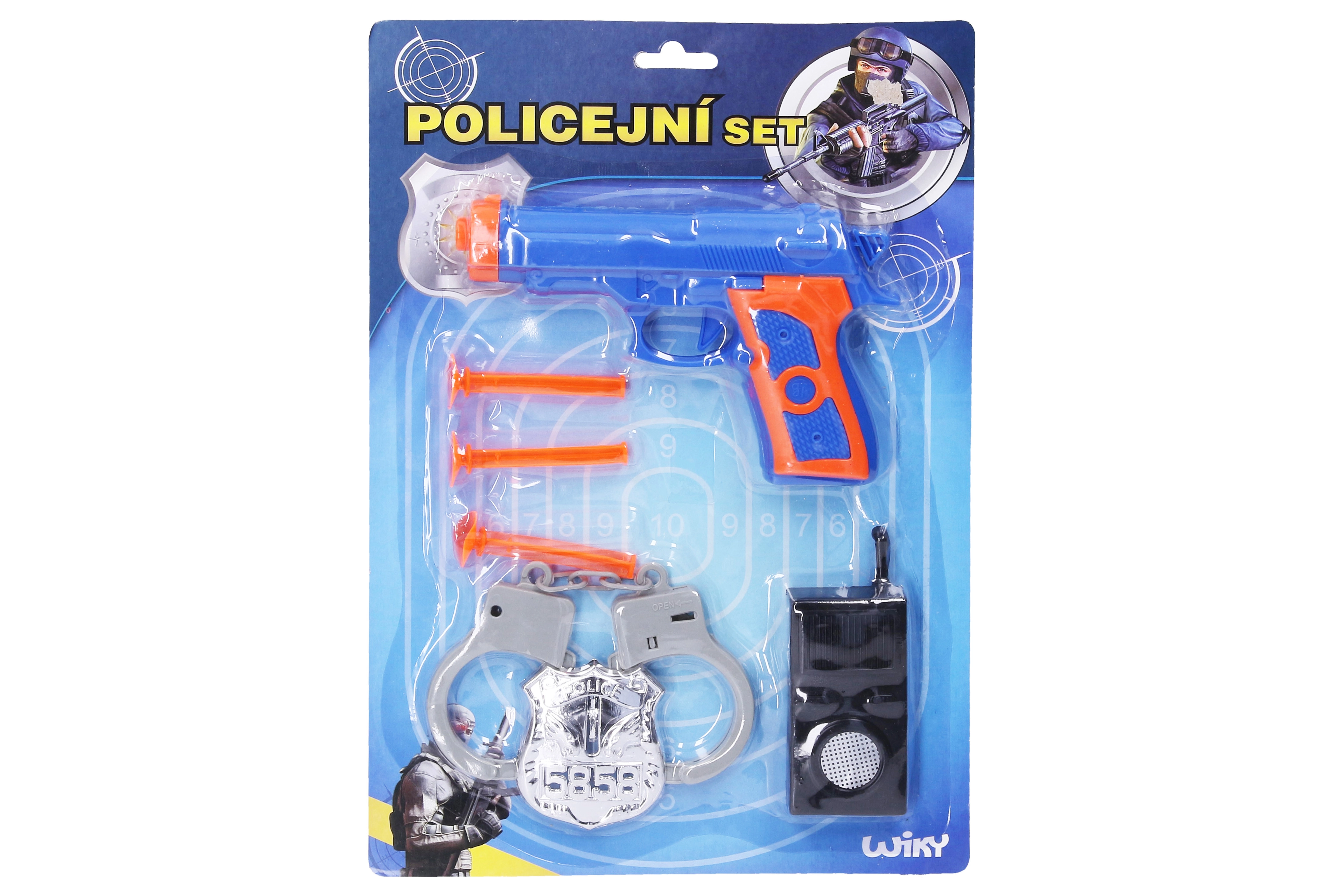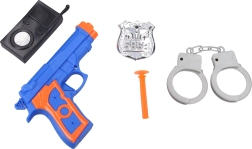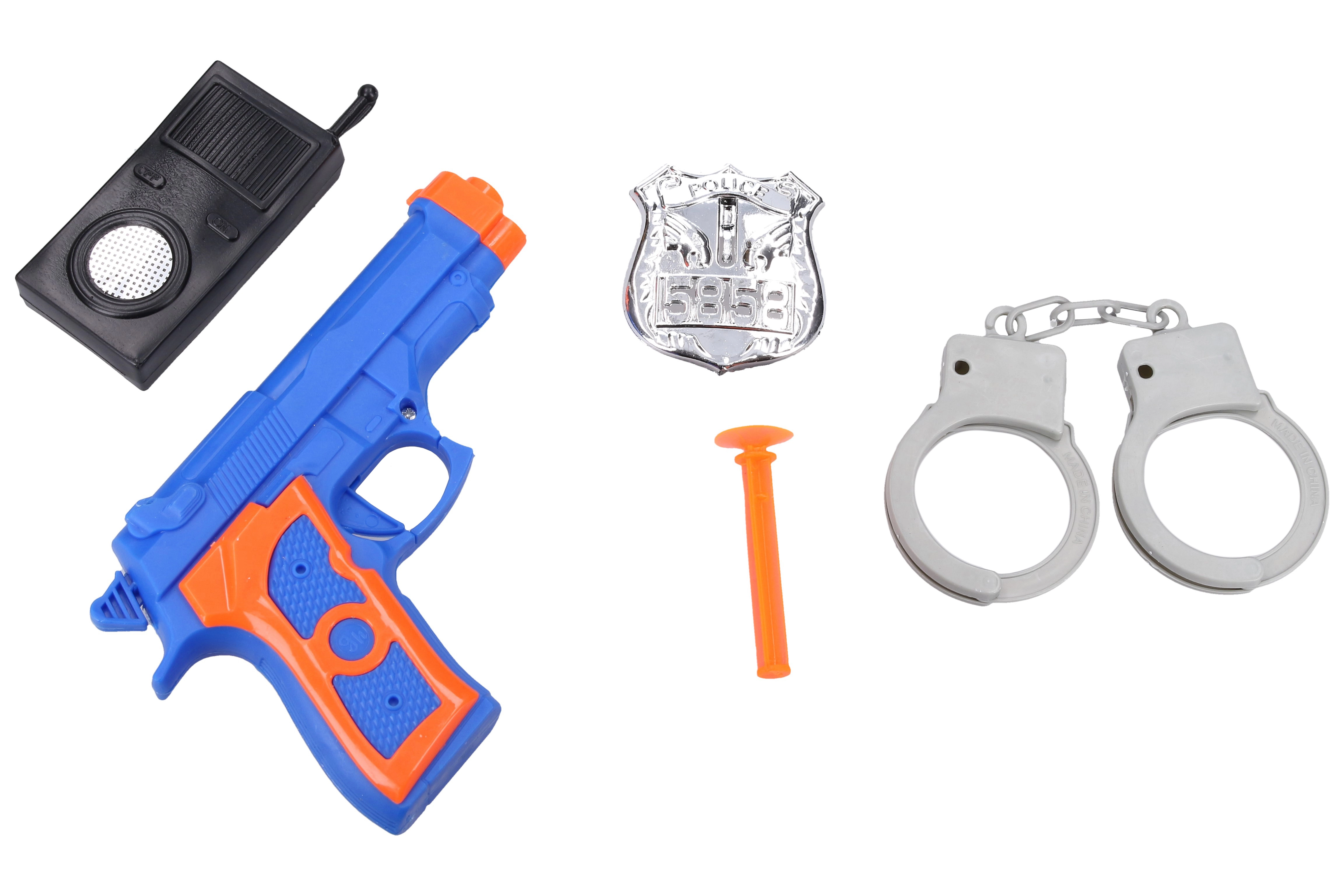 - pistola, placa, esposas, walkie-talkie, 3 dardos con ventosa