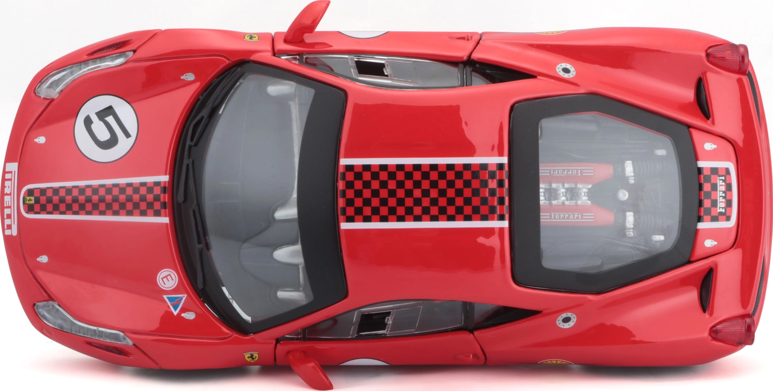 La pintura roja, el dorsal número 5 y los logotipos de patrocinadores aportan al modelo un aspecto de competición fiel, ideal para colecciones de FERRARI.