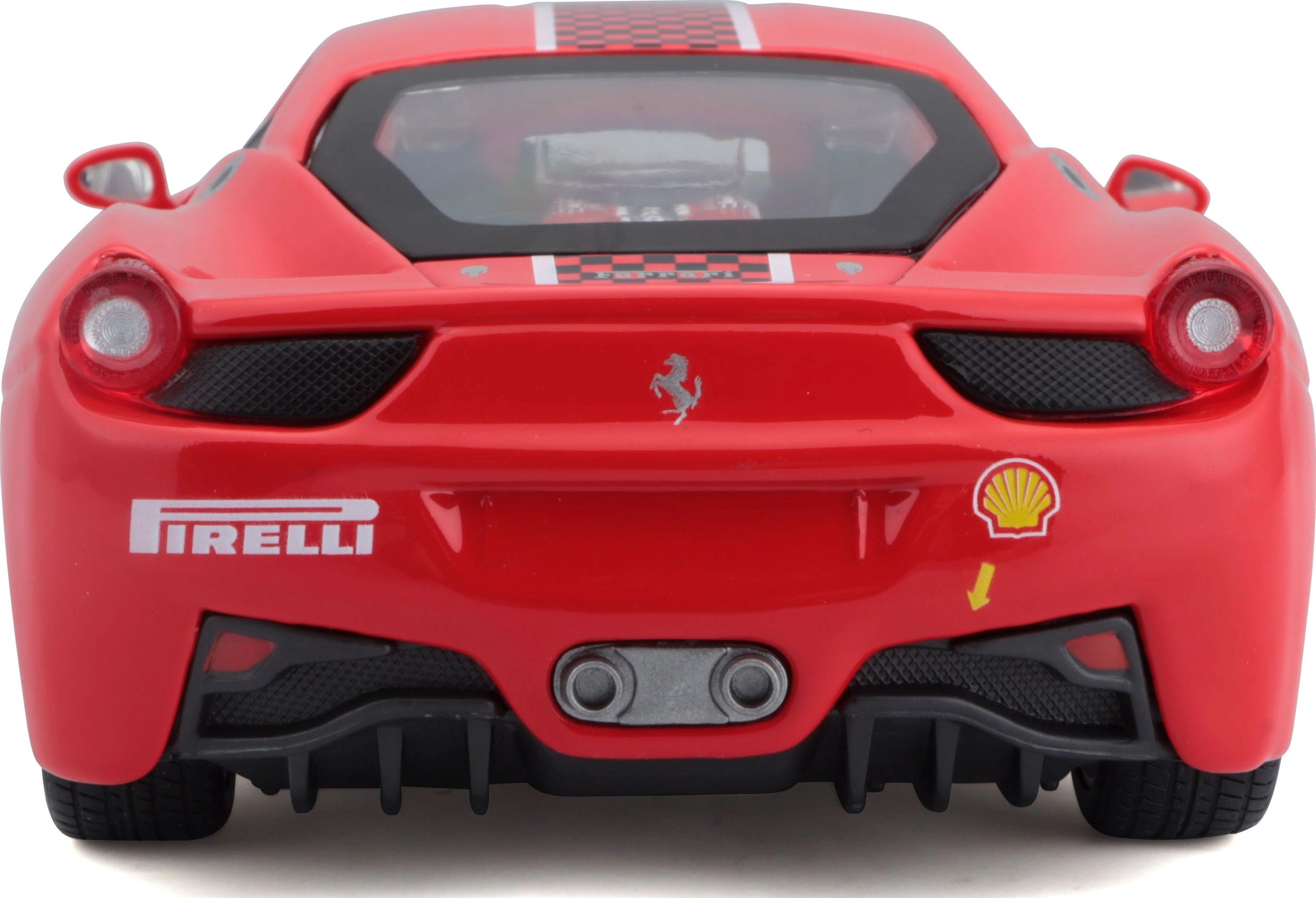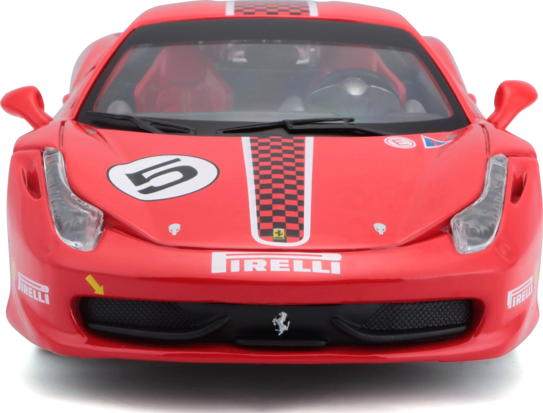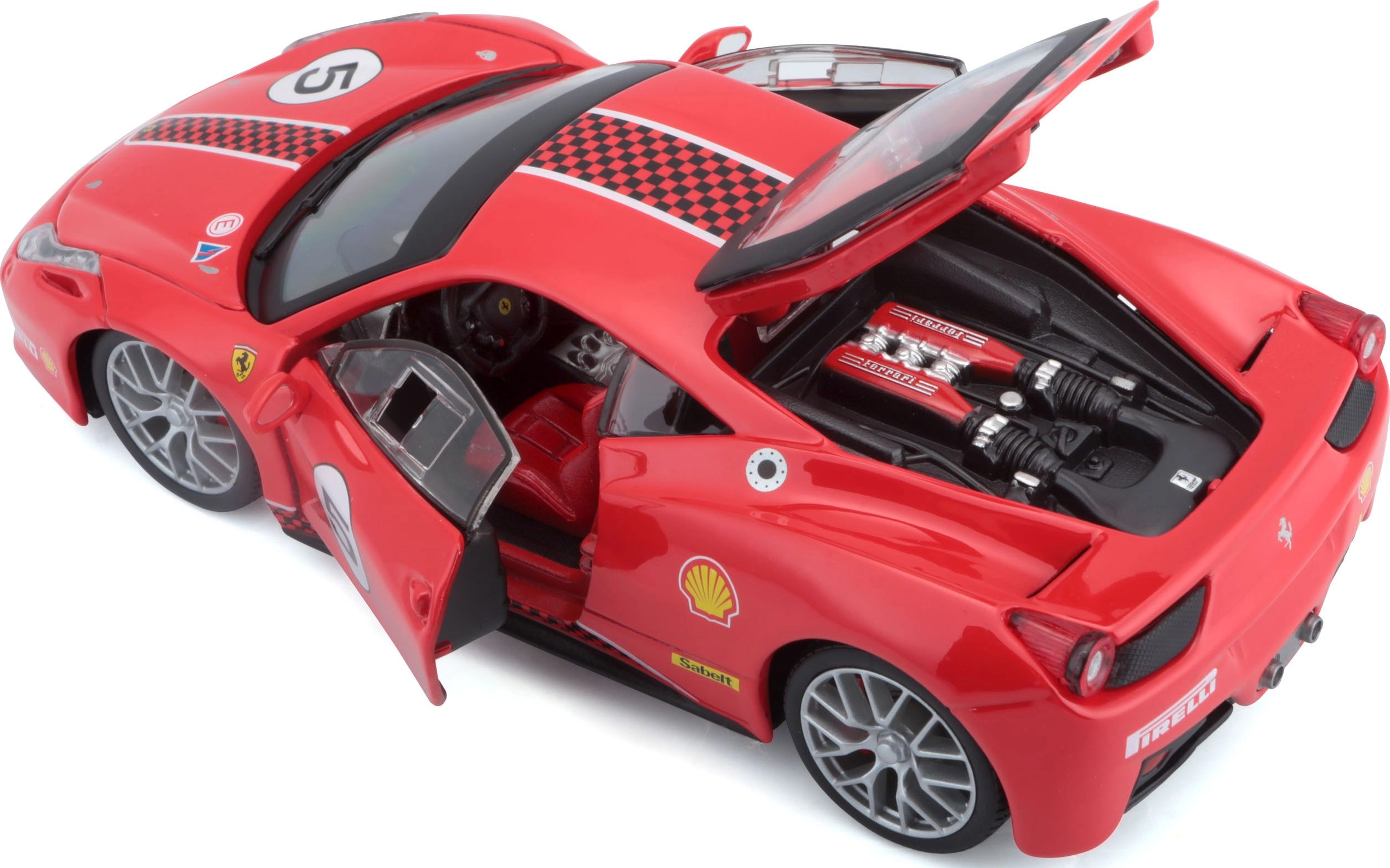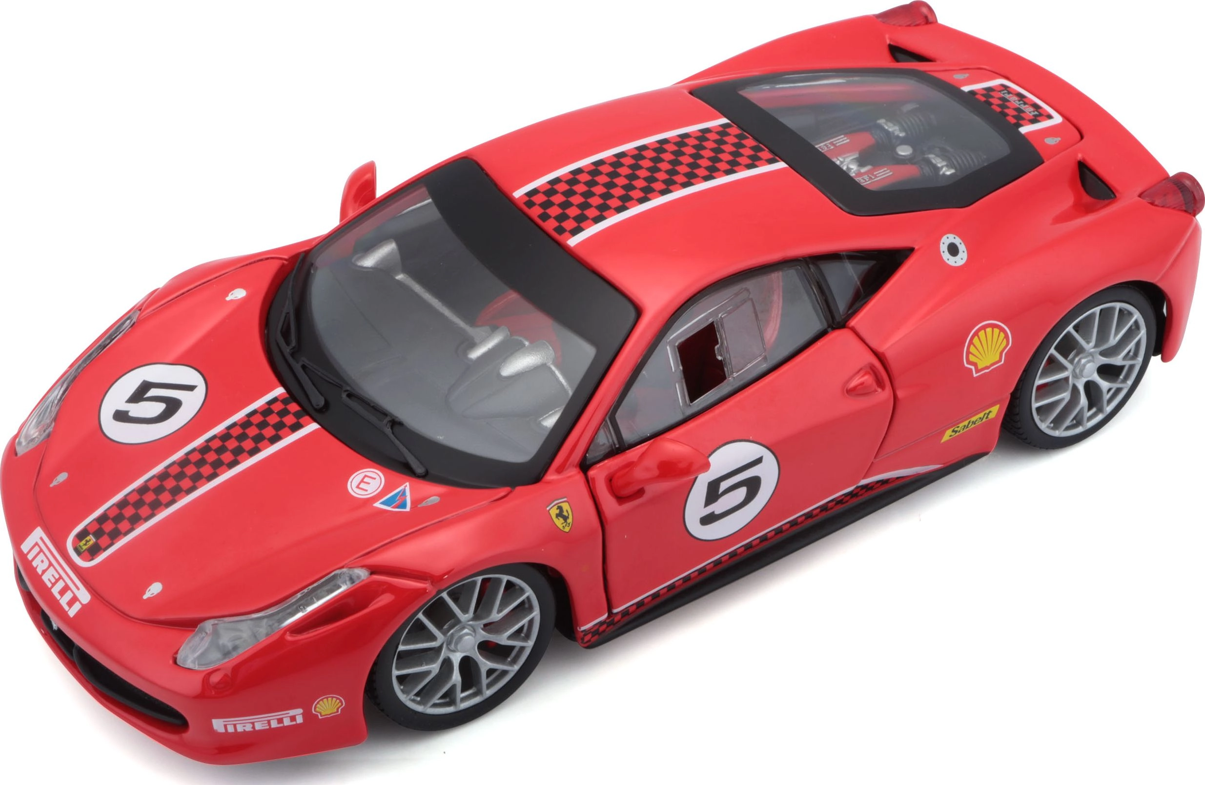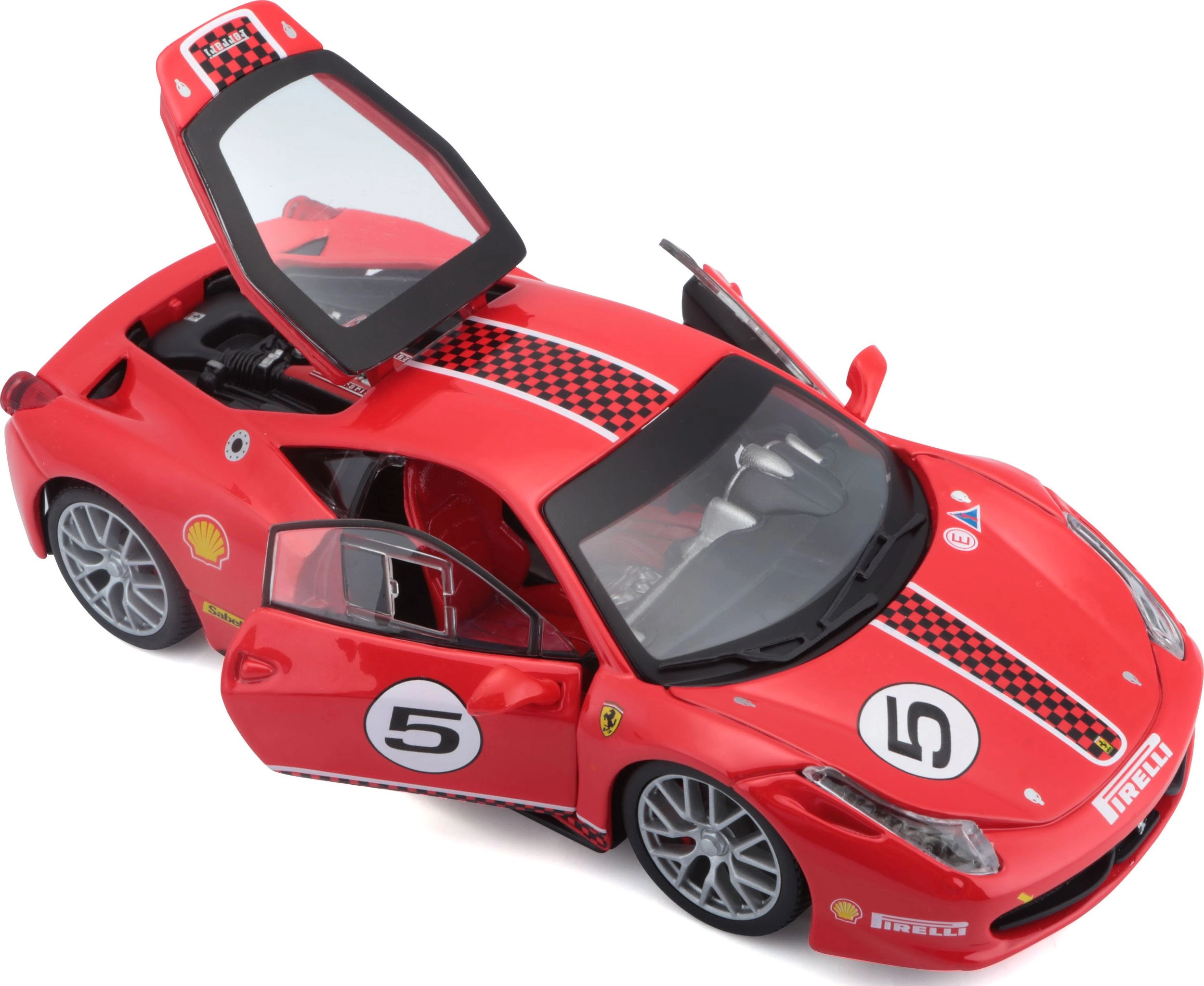 Este modelo con licencia del Ferrari 458 Challenge destaca por la alta calidad de la carrocería, impresiones precisas y proporciones fieles. Gracias a las partes abatibles y al interior detallado, es perfecto tanto para exposición como para jugar.
