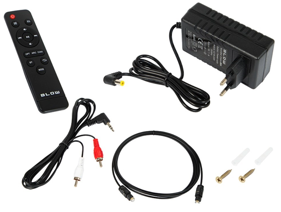 - barra de sonido, control remoto, adaptador de corriente, cableado, accesorios de montaje