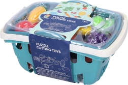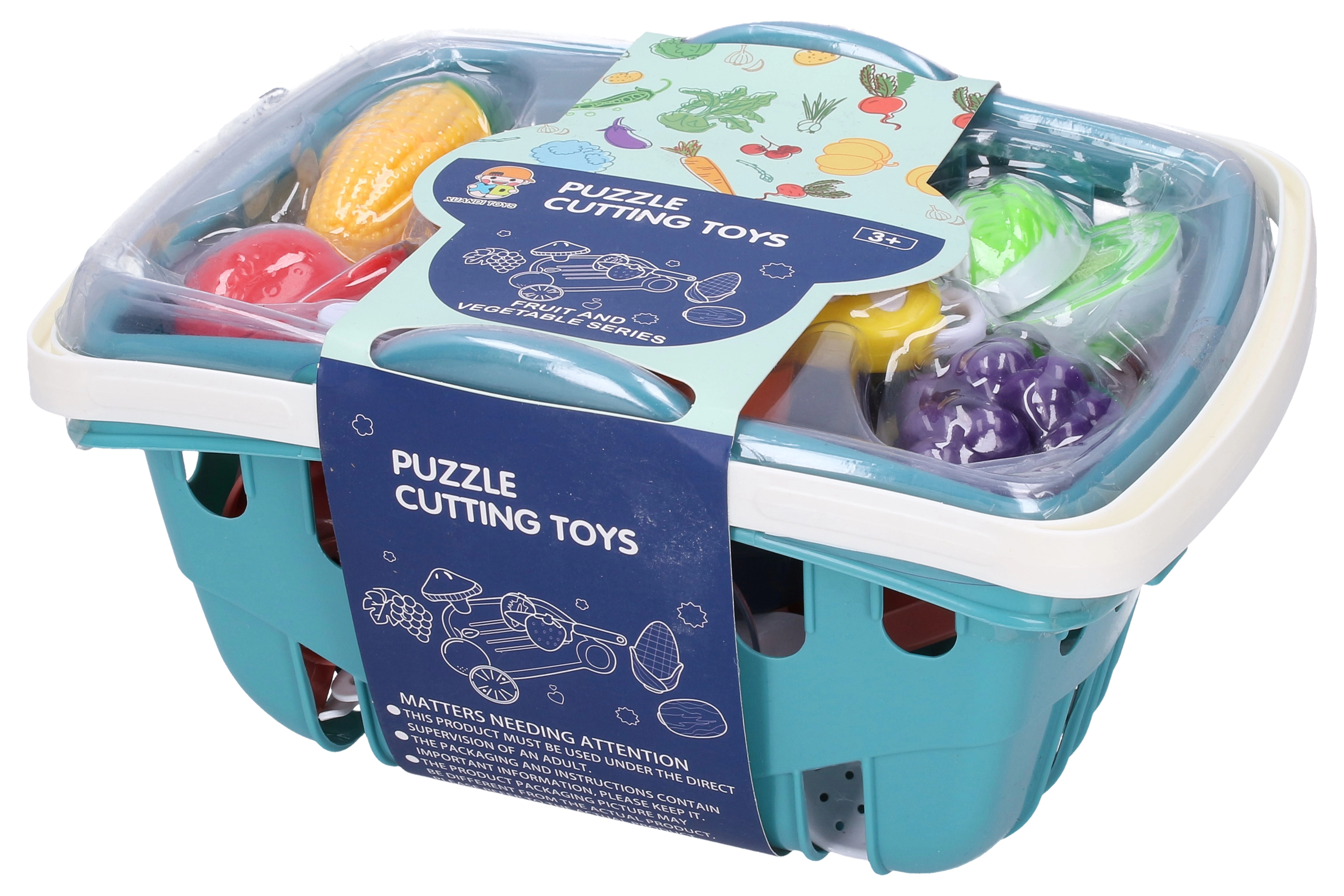 - Frutas y verduras para cortar, cuchillo infantil, otros utensilios, cesta