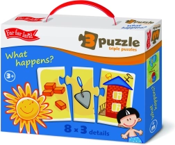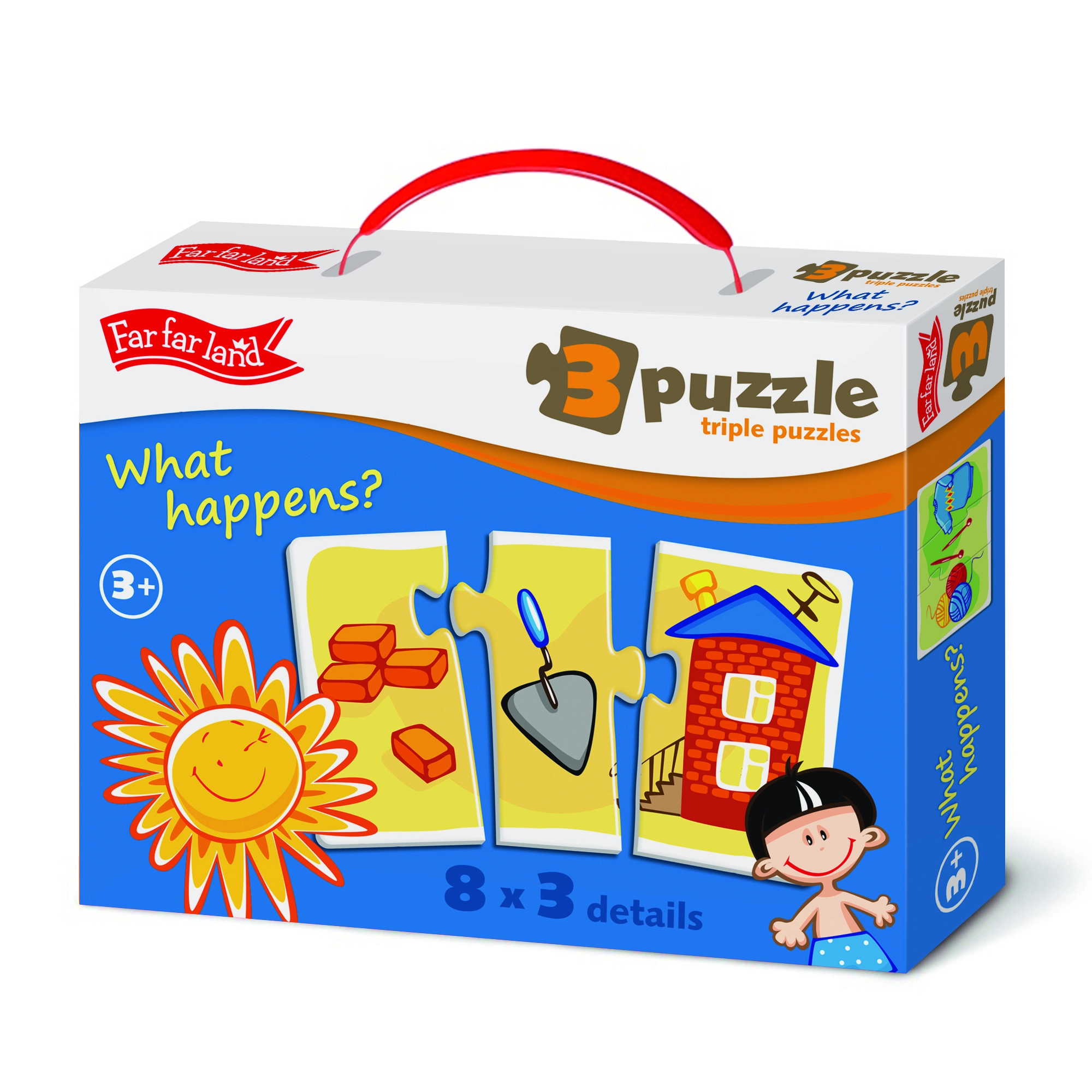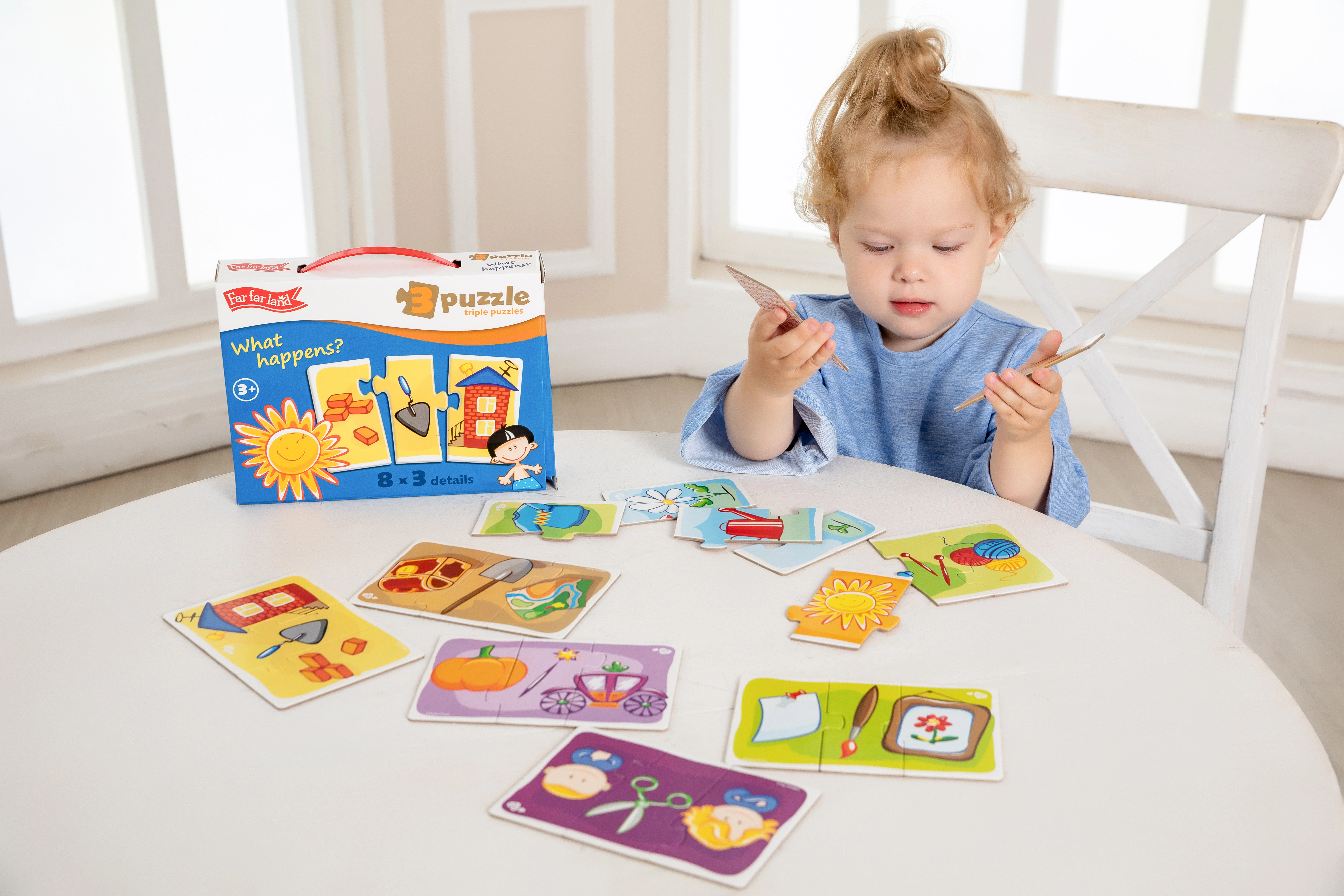 Descubre el ingenioso set de Far Far Land que enseña a los niños, de forma lúdica, la asociación y las conexiones entre objetos. Cada imagen está dividida en tres piezas y la tarea es encontrar el trío correcto que encaja. Montar las piezas fomenta la concentración, la paciencia y aporta alegría con cada motivo completado con éxito.