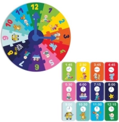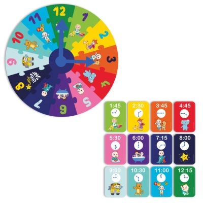 Colorido rompecabezas educativo con forma de reloj para niños a partir de 3 años, inspirado en la serie COCOMELON. Ayuda a desarrollar la motricidad fina, el reconocimiento de formas y colores e introduce a los niños en los fundamentos de la medición del tiempo de forma divertida.