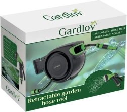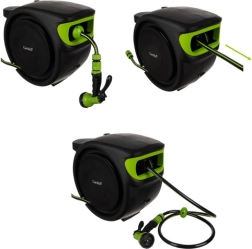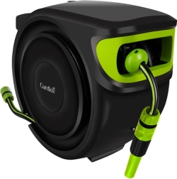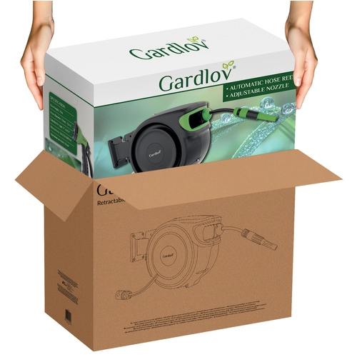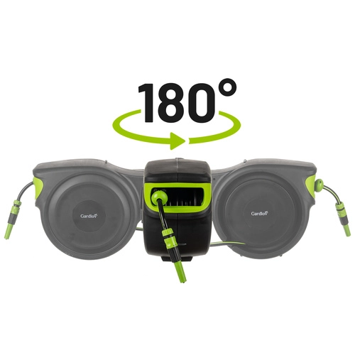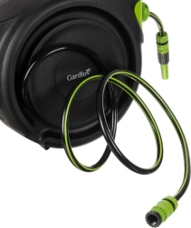 Solución completa para el jardín: el set incluye enrollador automático, manguera de jardín de 25 m, manguera de alimentación de 2 m, conectores rápidos 1/2", adaptador universal para grifo, soporte mural con giro de 180° y tacos de montaje. Gracias al enrollado fluido y controlado y al bloqueo de la pistola, el trabajo es rápido, limpio y seguro.