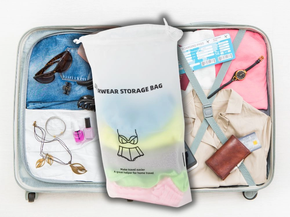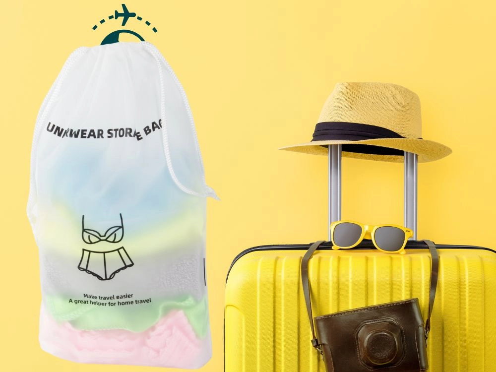 Mantén el orden en tus viajes con este práctico organizador para ropa interior. Gracias al material impermeable, el contenido se mantiene seco y limpio, mientras que su diseño ligero y el cierre con cordones garantizan un uso sencillo. Ideal para maletas, avión y bolsa de deporte.
