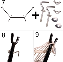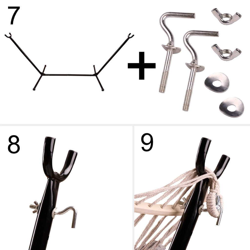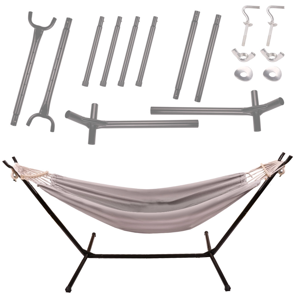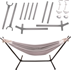 La barra separadora de madera facilita el subir y bajar y mantiene la superficie de descanso extendida. El set además incluye herramientas de montaje y una práctica bolsa de transporte con asas, para llevar o almacenar la hamaca fácilmente. Ideal para jardín, terraza o balcón amplio, sin taladros y sin compromisos.