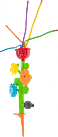 El montaje es muy sencillo: clava la punta en el suelo, conecta la manguera de jardín mediante un conector rápido estándar y listo. La construcción de plástico resistente soporta varias temporadas y sus colores vivos invitan a jugar una y otra vez.